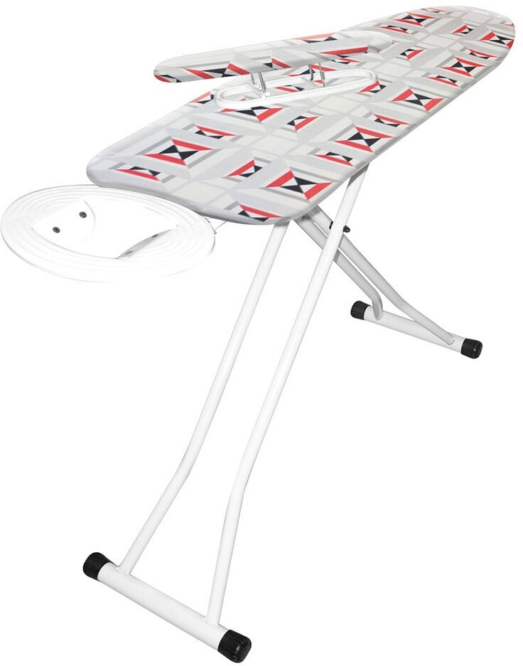 Гладильная доска с рабочей поверхностью 120*38 см в виде металлического перфорированного моноблока. Подставка для утюга (+45°) с силиконовыми вставками исключает выброс пара и отключение утюга. Хлопковый металлизированный чехол на войлочной подкладке облегчает процесс глажения. Высота доски регулируется до 90 см. Силиконовые насадки на ножках придают доске дополнительную устойчивость и не повреждают поверхность пола.