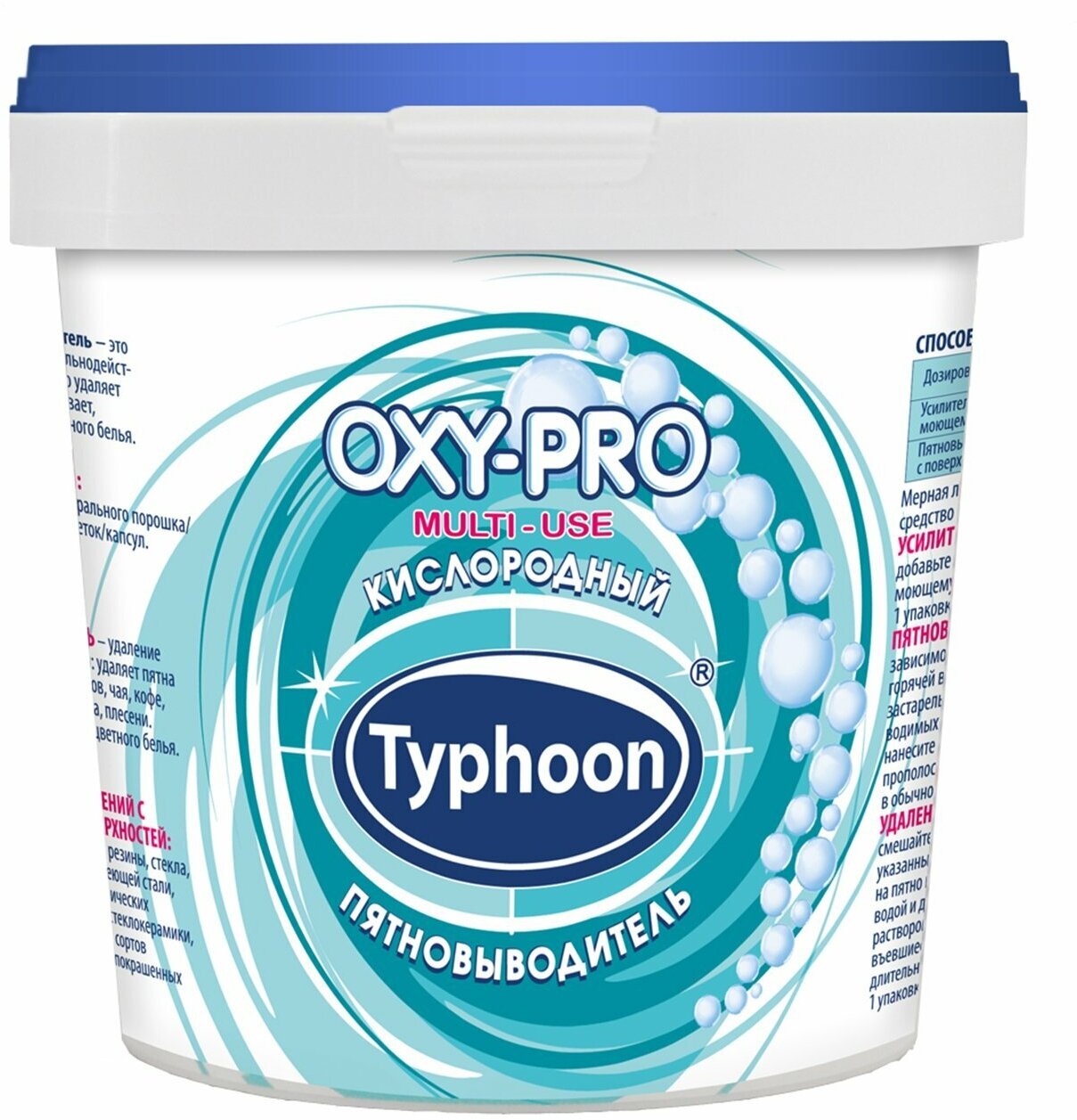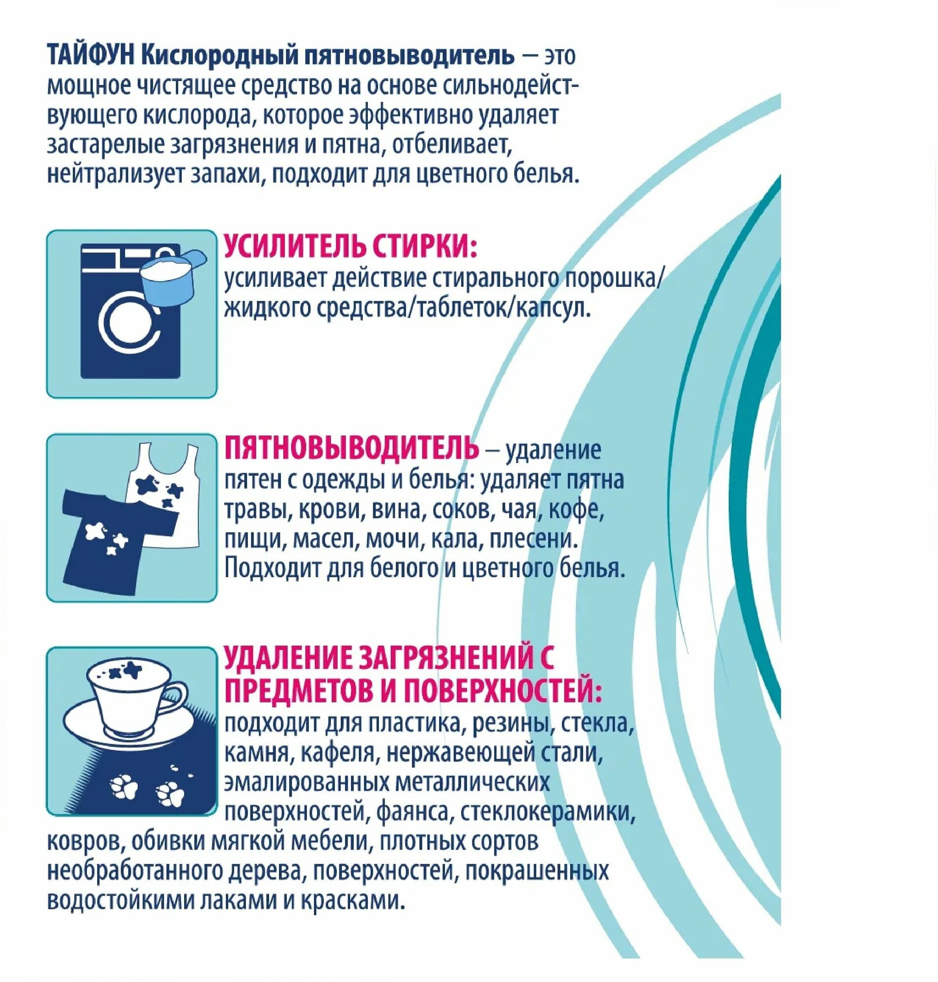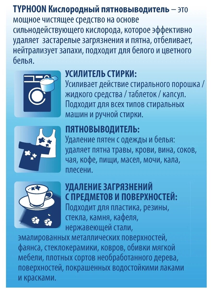 ТАЙФУН кислородный пятновыводитель - это мощное чистящее средство на основе сильнодействующего кислорода, которое эффективно удаляет застарелые загрязнения и пятна, отбеливает, нейтрализует запахи, подходит для цветного белья.