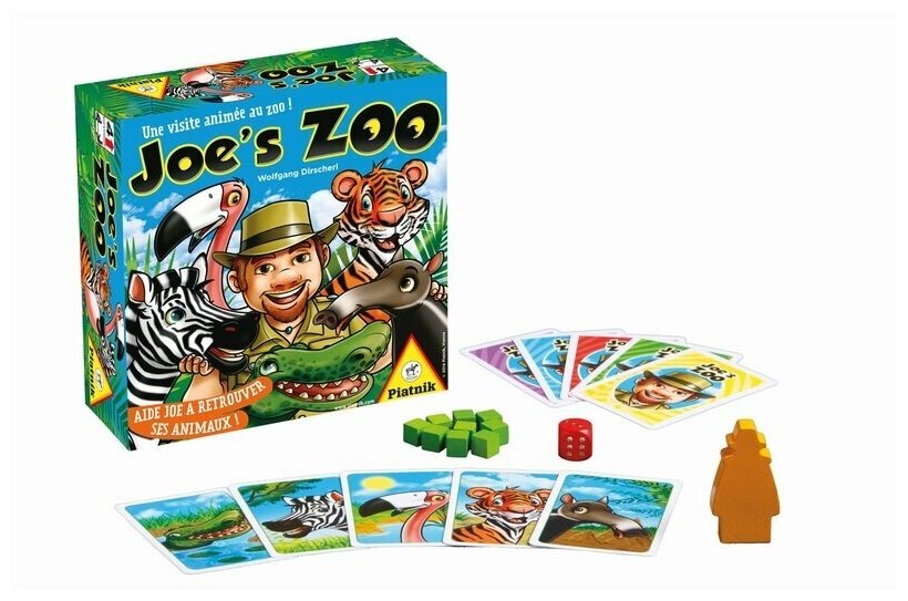«Зоопарк Джо» - это забавная игра от Piatnik на тренировку памяти и логического мышления, рассчитанная на детей старше 4 лет. Итак, вы находитесь в зоопарке. Его смотрителю Джо требуется помощь – животные выбрались из своих вольеров и где-то прячутся. Помогите Джо найти крокодила, фламинго, зебру, муравьеда и тигра. Получайте лакомства за поимку животных. Нашедший больше всего животных игрок признается победителем.