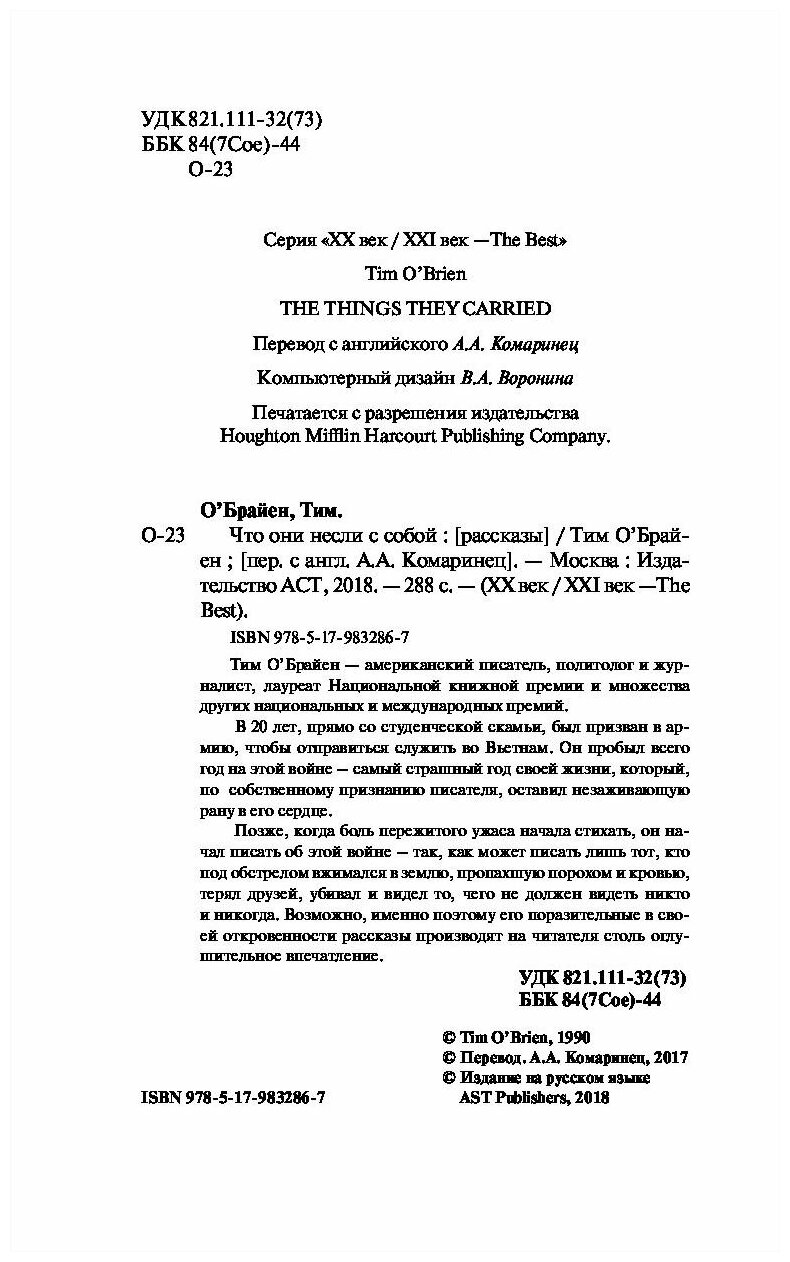 Тим О'Брайен - американский писатель, политолог и журналист, лауреат Национальной книжной премии и множества других национальных и международных премий.