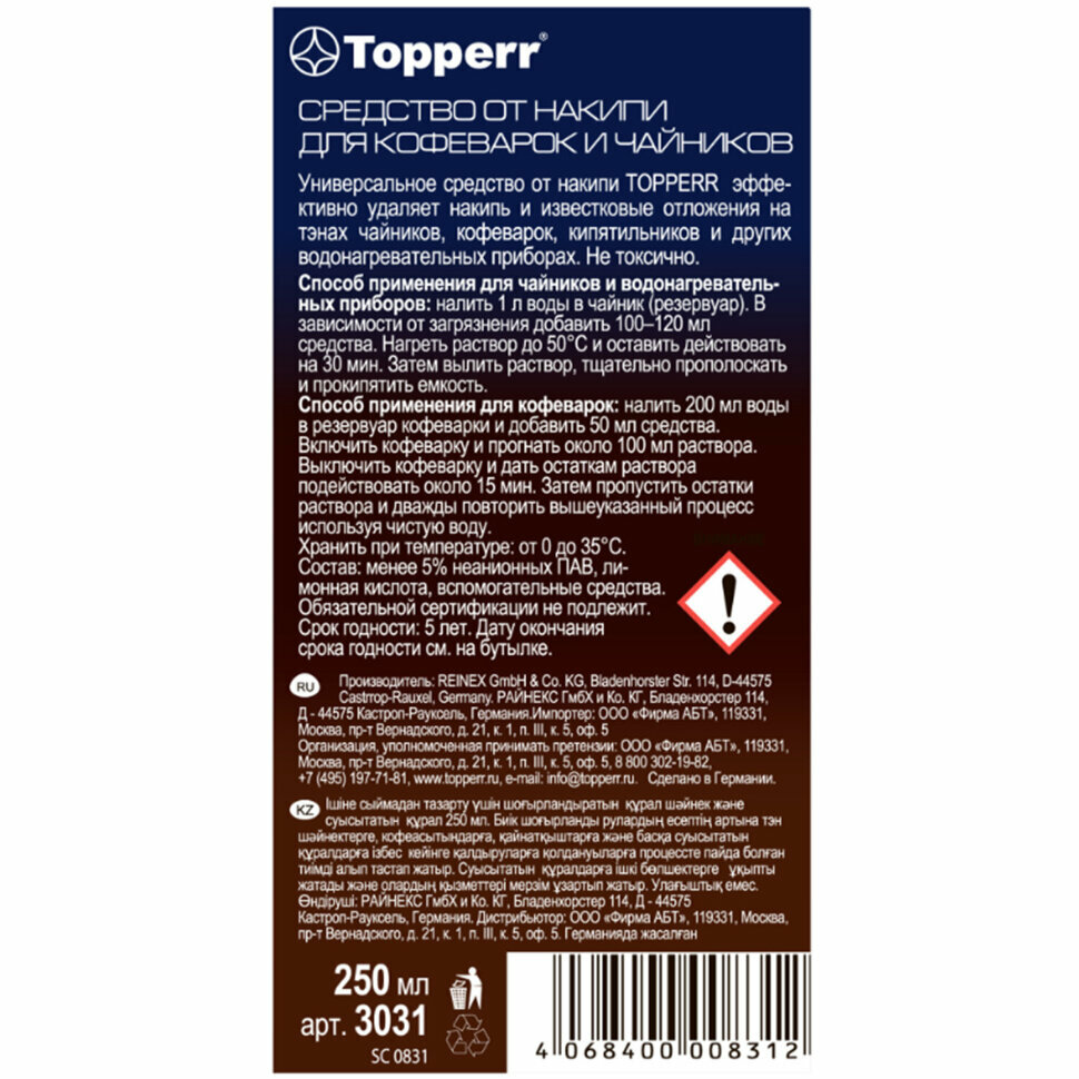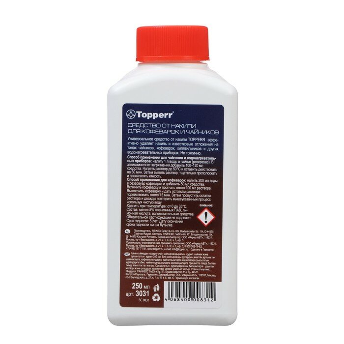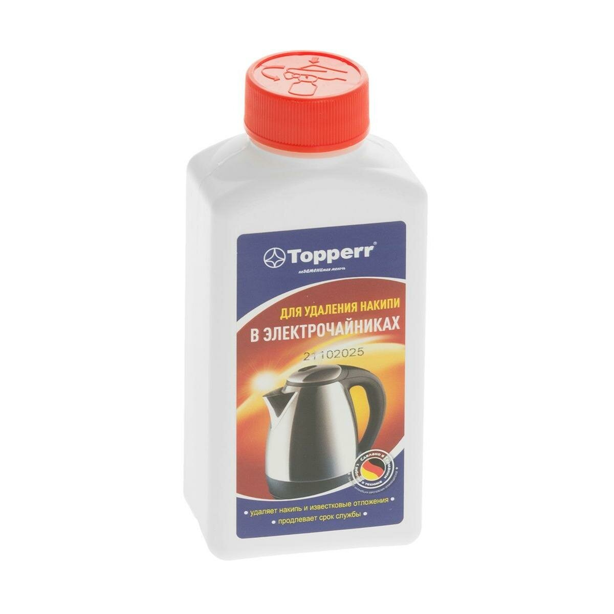 Чистящее средство Topperr предназначено для очистки внутренних поверхностей и нагревательных элементов в чайниках или водонагревательных приборах любой марки. Эффективен при удалении накипи с пластика, металла и стекла.