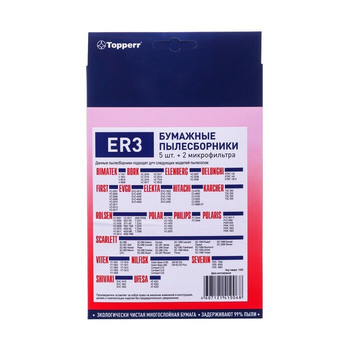 Бумажные пылесборники для пылесосов BIMATEK, BORK, ELEKTA, ELENBERG, ROLSEN, SCARLETT, VITEK изготовлены из экологически чистой двухслойной бумаги, соответствующей европейскому стандарту качества, задерживают 99% пыли, продлевая срок службы пылесоса, сохраняют чистоту воздуха и устраняют вредные бактерии.