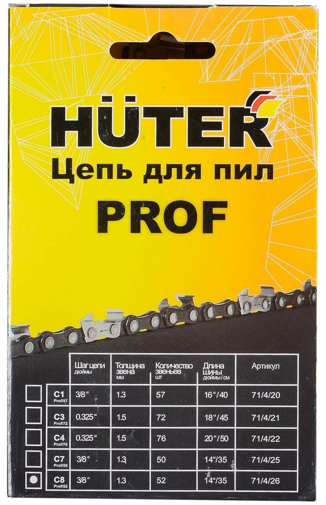 Цепь для электропил и бензопил HUTER . Профессиональный режущий инструмент обладает высокой производительностью. Режущие зубья изготовлены из специальной стали. В основном применяется для бытовых работ: подрезки сучьев в саду, небольшого ремонта, пиления дров для камина.