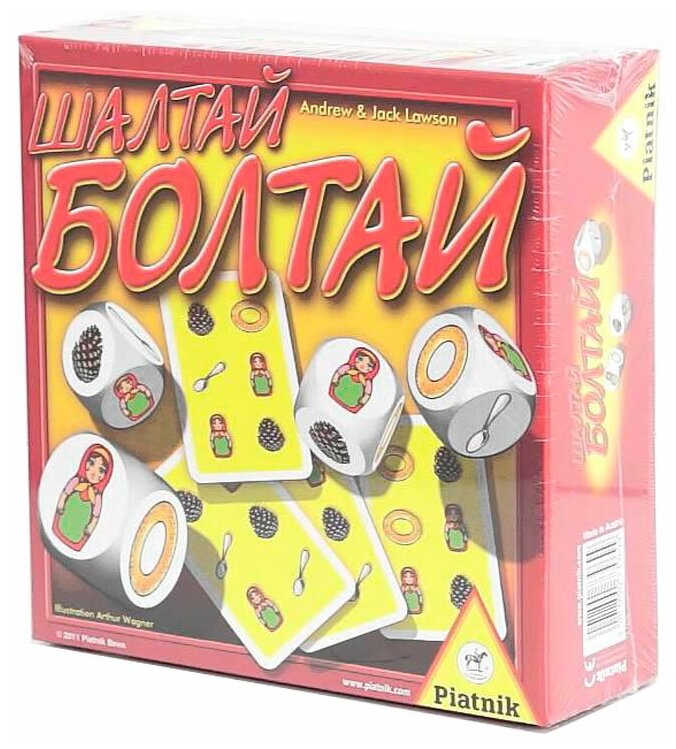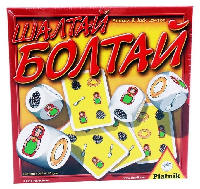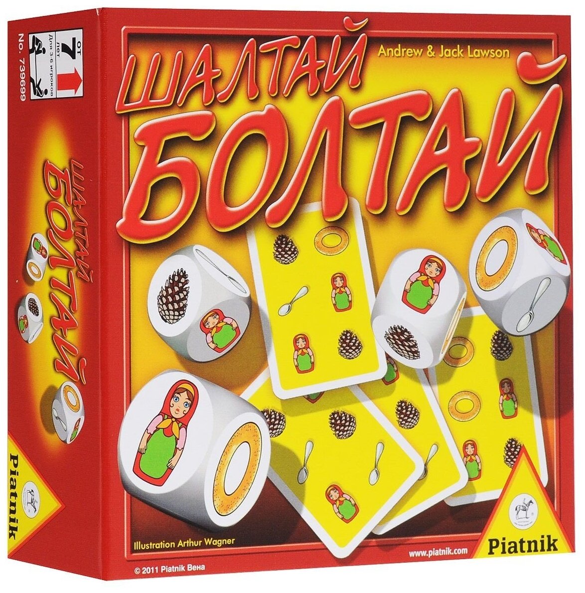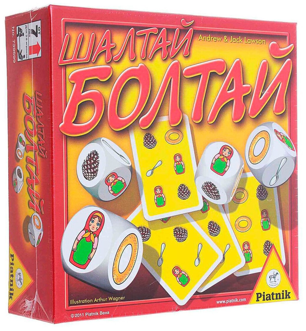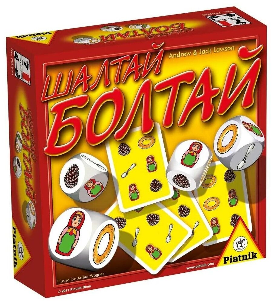 Игра «Шалтай Балтай» от австрийского бренда Piatnik учит быстро думать, быстро говорить и делать несколько вещей одновременно! В яркой коробке вы найдете 4 кубика, 40 карточек и правила игры на русском языке. На грани кубиков нанесены рисунки – матрешки, ложки, шишки, бублики… Бросайте кубики! Теперь вам нужно как можно быстрее отыскать соответствующую результату броска карточку, а также проговорить на скорость все, что вы видите на кубиках и на карте.
