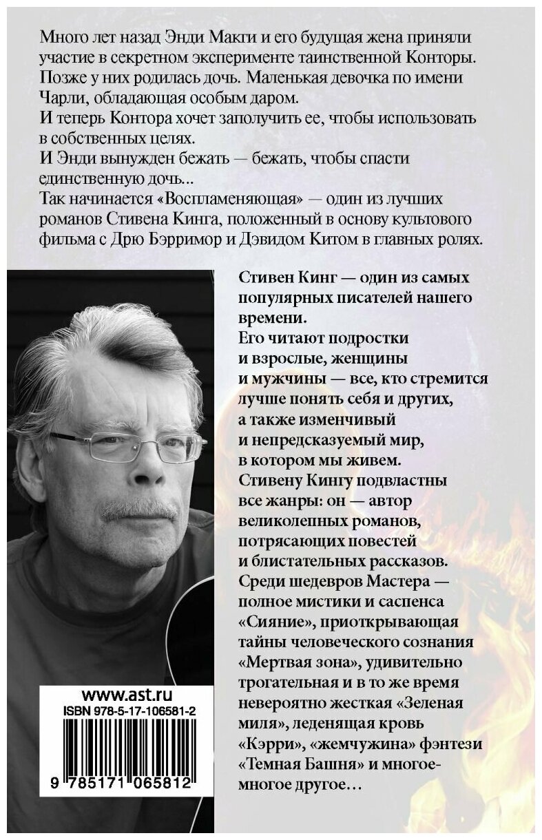 один из любимых романов стивена кинга, по которому еще и фильм сняли. это радует. и в главной роли дрю бэримор. о чем же расскажет нам воспламеняющая? хороший вопрос. эта книга об отце, который всеми силами пытается защитить свою дочь. эта книга об незаконных испытаниях над человеком. эта книга о маленькой девочке, за которой охотится мир в лице конторы. книга чем то напоминает бегущего человека. именно бегством, спасением, прятками и шпионажем. читается на одном дыхании и действительно может захватить читателя в свои сети. советую ее почитать. стивен кинг как всегда на высоте. он держит планку, не впадает в моразм и не делает нудных ответвлений. браво, маэстро