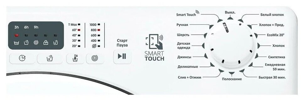 | Режимы стирки | Белый Хлопок/Прочные ткани, Микс/Эко 20°C, Быстрая 30 мин, Быстрая 59 мин, Ручная мтирка, Шерсть, Хлопок, Предварительная, Смешанное Белье, Полоскание, Джинсы, Детская, Отжим + Слив, Деликатная |