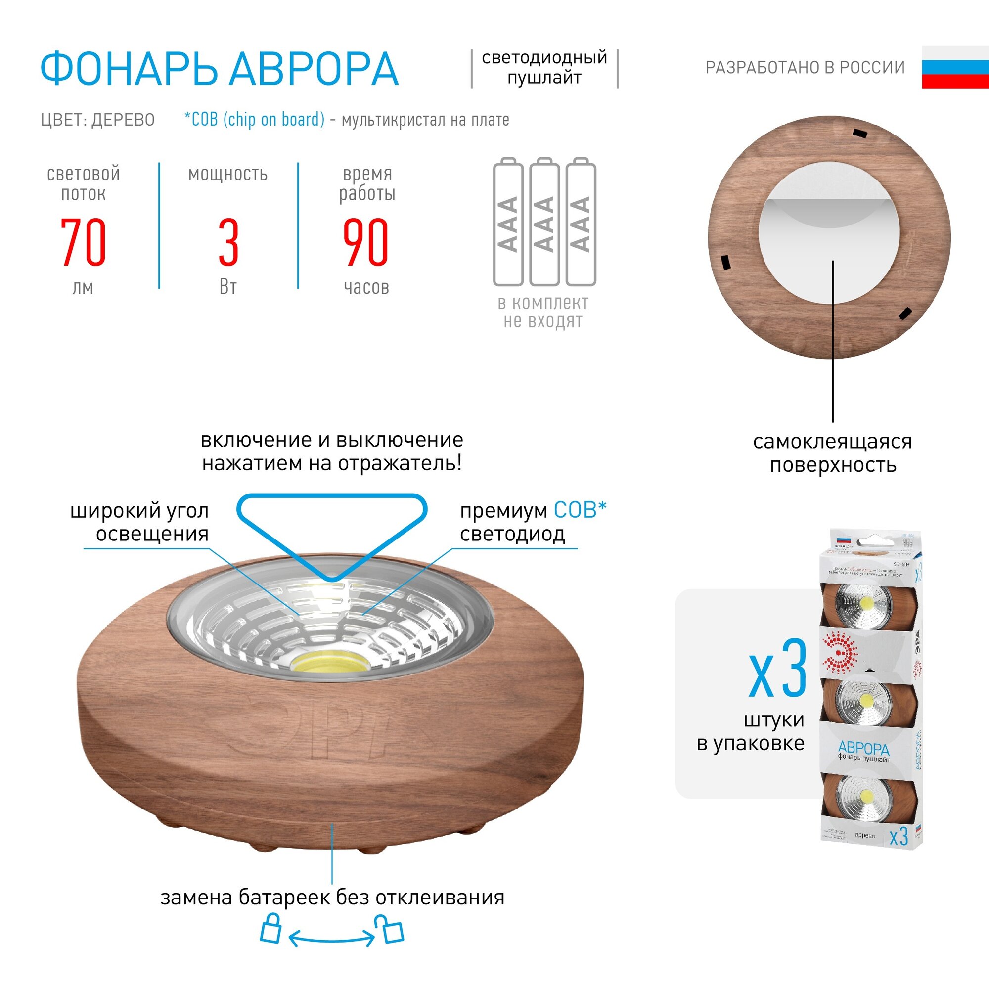 Туризм Эра Б0031045 Фонарь ЭРА Аврора типа пушлайт можно разместить везде, где заблагорассудится: над импровизированным столиком в кемпинге, на стене в изголовье кровати, в автомобиле. Он работает совершенно автономно, от трех батареек AAA, а задняя поверхность его самоклеящаяся.