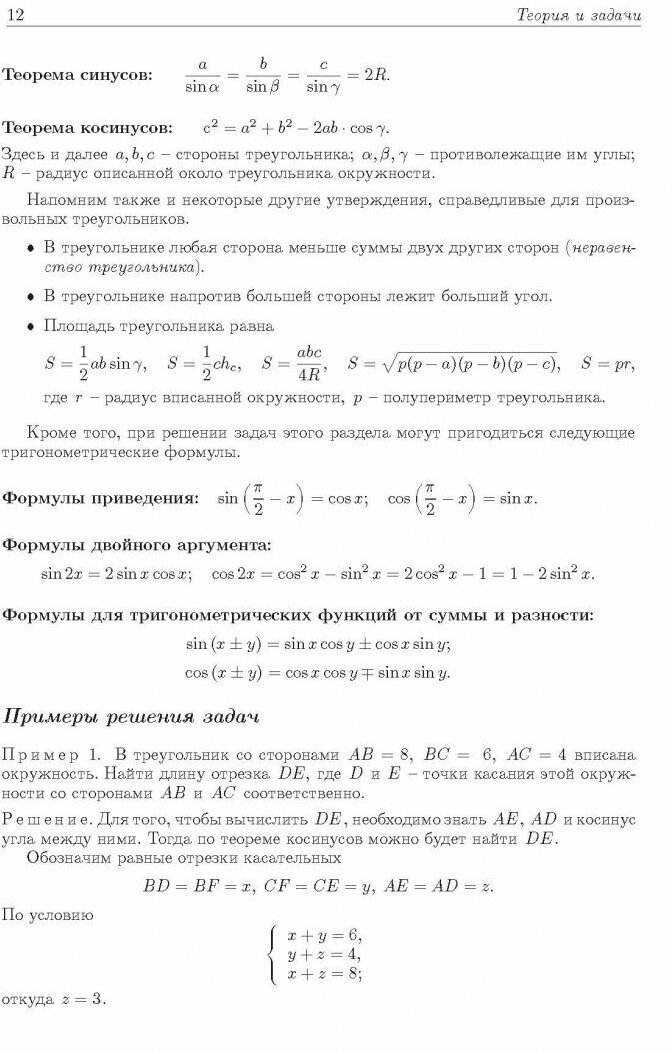 Книга разделена на две части. В первой ( в зависимости от темы) кратко дана необходимая теория, затем даны несколько решенных задач, потом - задачи для самостоятельного решения (ответы на них есть в конце книги).Во второй части даны задачи с решением по темам. Если не очень получилось решить задачу в первой части книги, то можно почитать решенные по этой же теме. В конце книги есть задачи разных лет , предлагавшиеся на выпускных и на вступительных экзаменах в МГУ. Полезная книга.