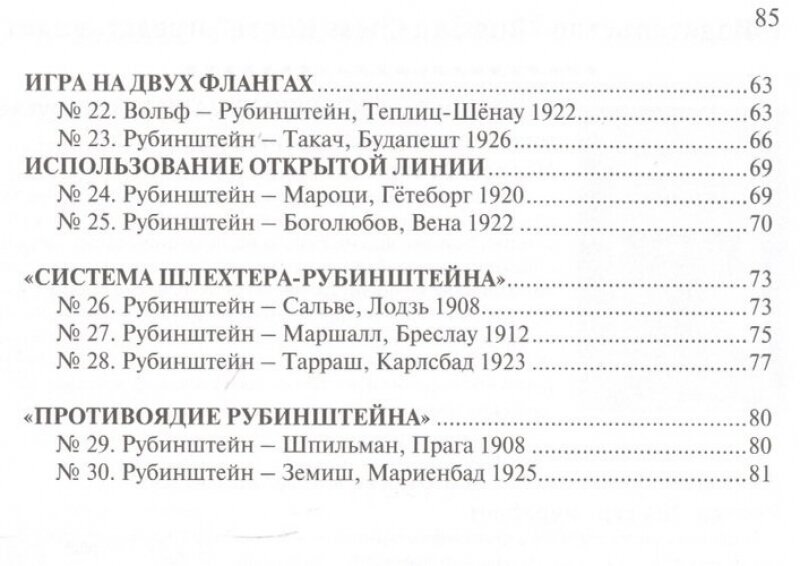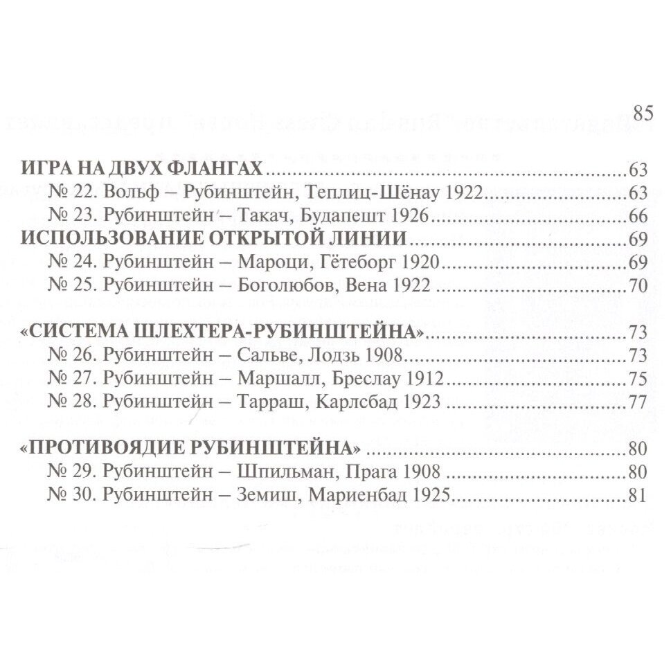 Гениальный польский гроссмейстер Акиба Рубинштейн внес значительный вклад в развитие шахматного искусства. Принципы позиционной школы, провозглашенные В. Стейницем и развитые в трудах З. Тарраша, достигли своего идеального гармоничного воплощения в творчестве "великого Акибы". 30 партий Рубинштейна, отличающихся предельной ясностью и лаконичностью, составляют "квинтэссенцию" творческих достижений великого маэстро. Они, без сомнения, являются превосходной школой позиционной игры и доставят огромное эстетическое удовольствие любителям шахмат.В учебных целях материал распределен по тематическим разделам.Для широкого круга любителей шахмат.