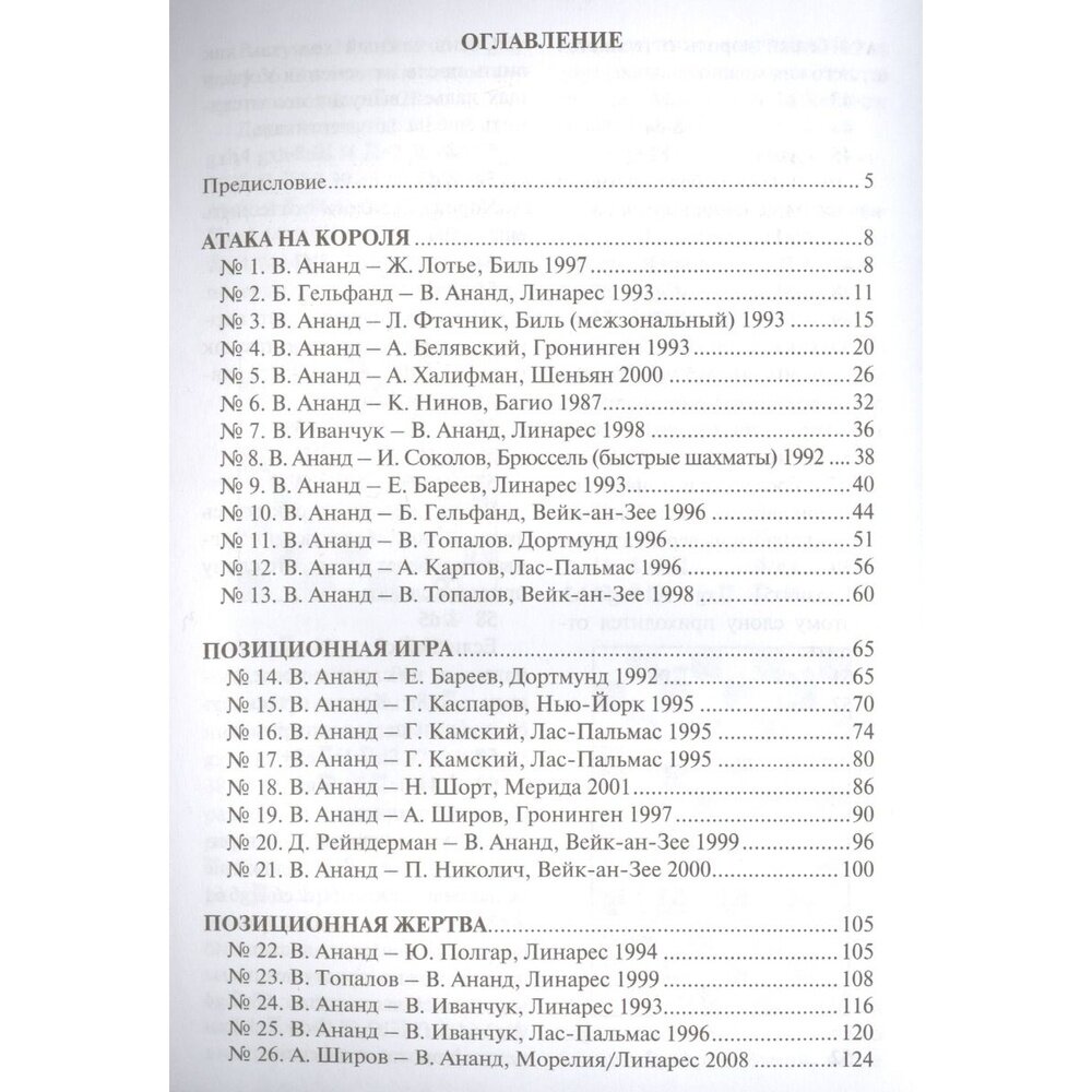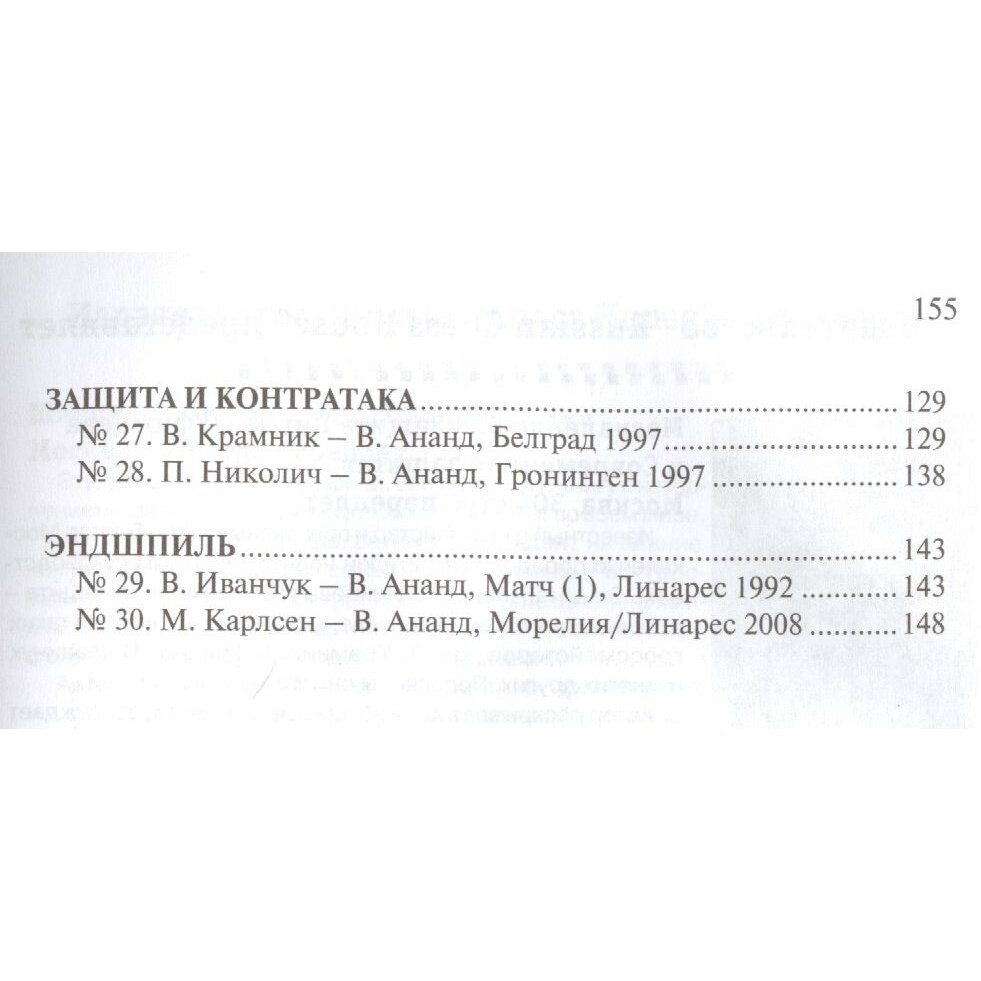 Пятикратный чемпион мира Виши Ананд уже три десятилетия входит в число сильнейших шахматистов планеты. Его инициативный, красивый стиль игры, равно как и безупречные спортивные качества, завоевали сердца многочисленных поклонников шахмат.Тридцать партий, вошедших в эту книгу, доставят читателям не только большое эстетическое удовольствие. Особую методическую ценность представляют комментарии индийского гроссмейстера, гармонично сочетающие в себе общие рассуждения и конкретный анализ.В учебных целях партии разбиты по тематическим разделам.Для широкого круга любителей шахмат.