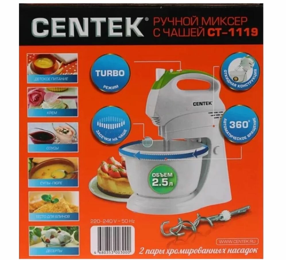 | Прочие особенности и свойства | Миксер Centek CT-1105 легко справится с поставленными задачами. Насадка в виде спирали предназначена для замешивания теста для всех видов домашней выпечки или смешивания сухих ингредиентов. Миксер имеет режим турбо, для ускоренного вымешивания и взбивания. Функция движущейся чаши поможет ускорить эти процессы за счет разного направления вращения насадок и емкости. Кнопка для простого отсоединения насадок и резиновые ножки для устойчивости обеспечивают максимальный комфорт во время использования.,,Объем чаши (л):3.5 л,Длина шнура питания:1.2 м,Цилиндрическое сечение венчиков,Переключатель скоростей |