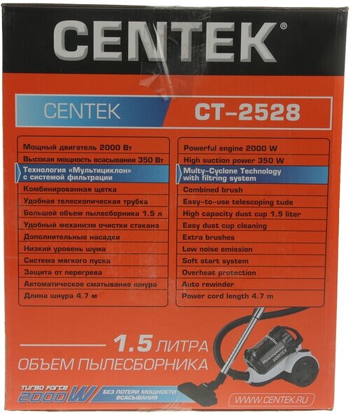 Пылесос Centek компактный и мощный пылесос с системой мультициклон. Он обладает высокой мощностью всасывания, равной 350 Вт, что обеспечивает отличный результат уборки. В качестве пылесборника в этой модели выступает контейнер, который имеет объем 1.5 литра.