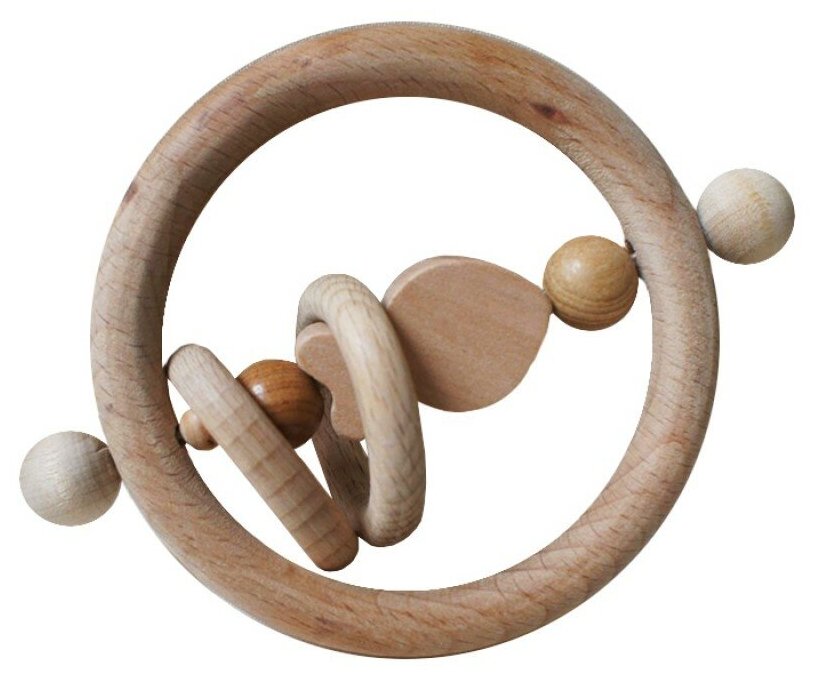 Погремушка пригодится ребенку, когда у него начнут резаться зубки. Погремушка представляют собой деревянное кольцо, не обработанное красителями, лаками и прочими материалами. То есть ребенок будет "грызть" чистое дерево. В то же время внутри колечка помещена яркая разноцветная игрушка-погремушка.