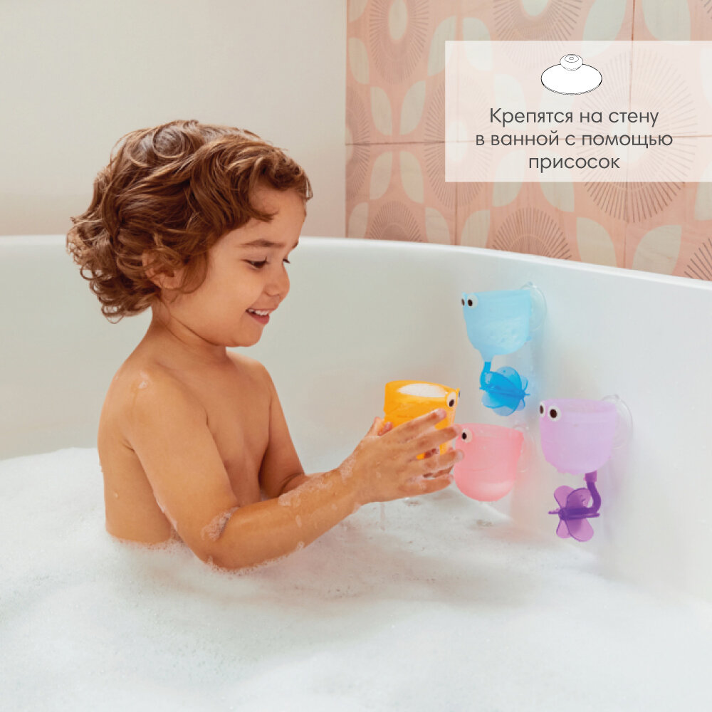 Устроить настоящий водопад в собственной ванной - легко! Купание станет гораздо веселее, если прикрепить над ванной красочные чашечки и следить, как через них замысловато переливается вода. Три чашечки из комплекта легко крепятся на стену с помощью специальной присоски, каждая из них имеет специальный подвижный элемент, который направляет струю воды и делает игру гораздо увлекательнее. Четвертая чашка предназначена для того, чтобы малыш зачерпывал ею воду.