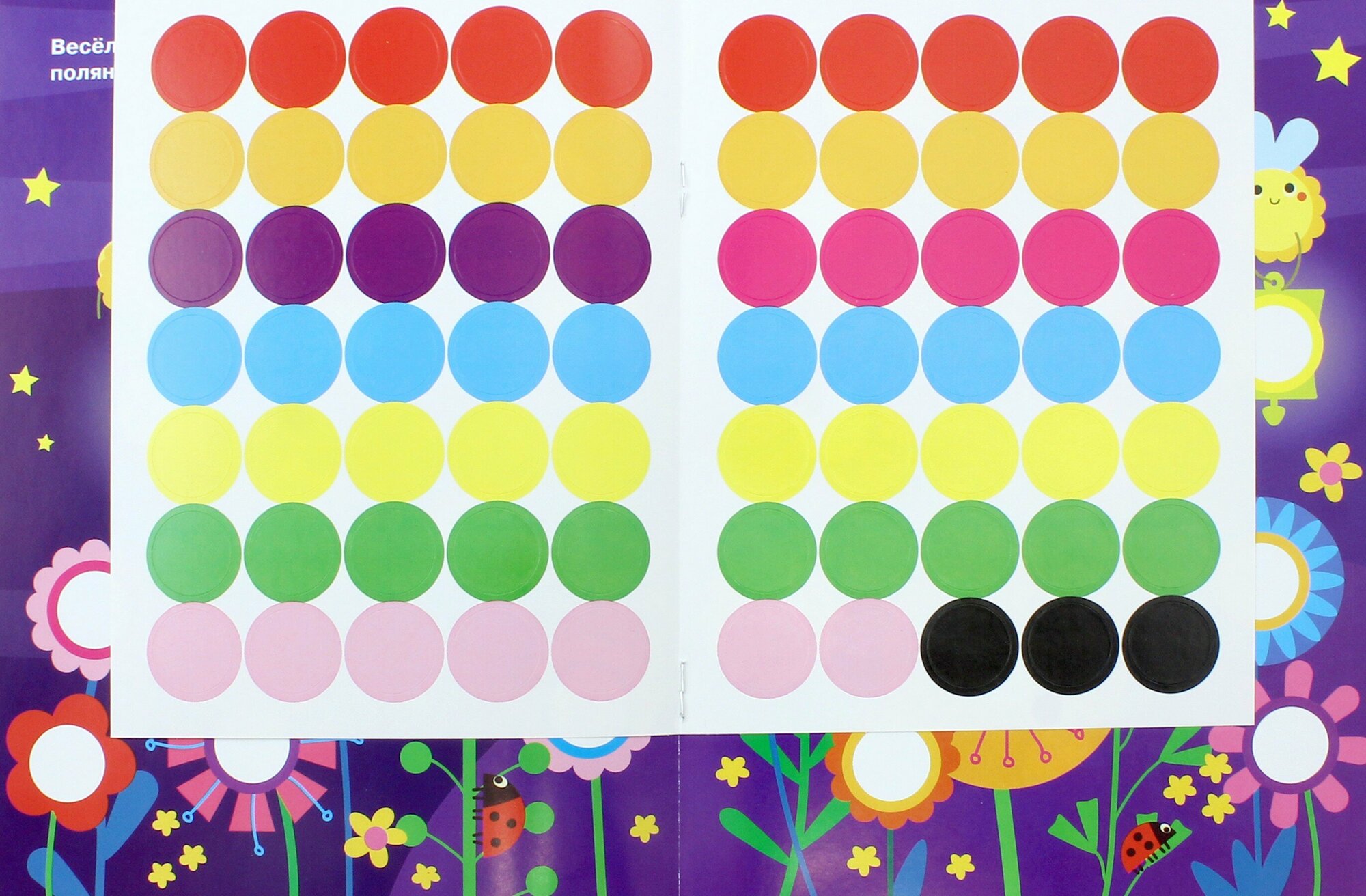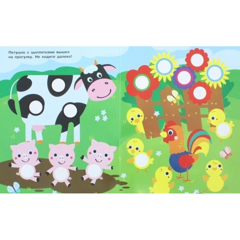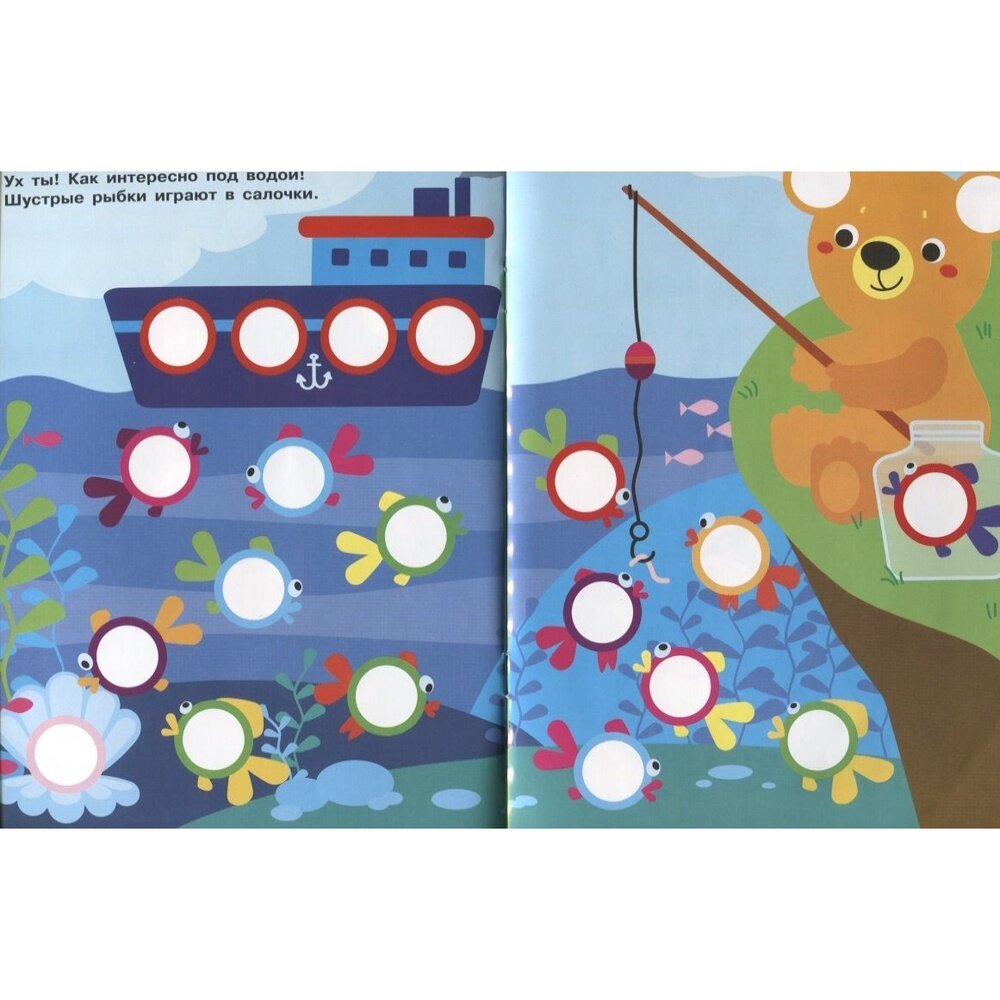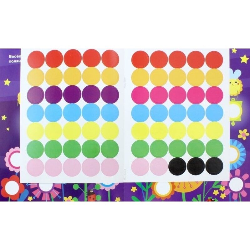 Книжка с комплектом разноцветных наклеек-кружочков поможет вашему малышу запомнить названия цветов и предметов, а также поспособствует развитию усидчивости, внимания и мелкой моторики.