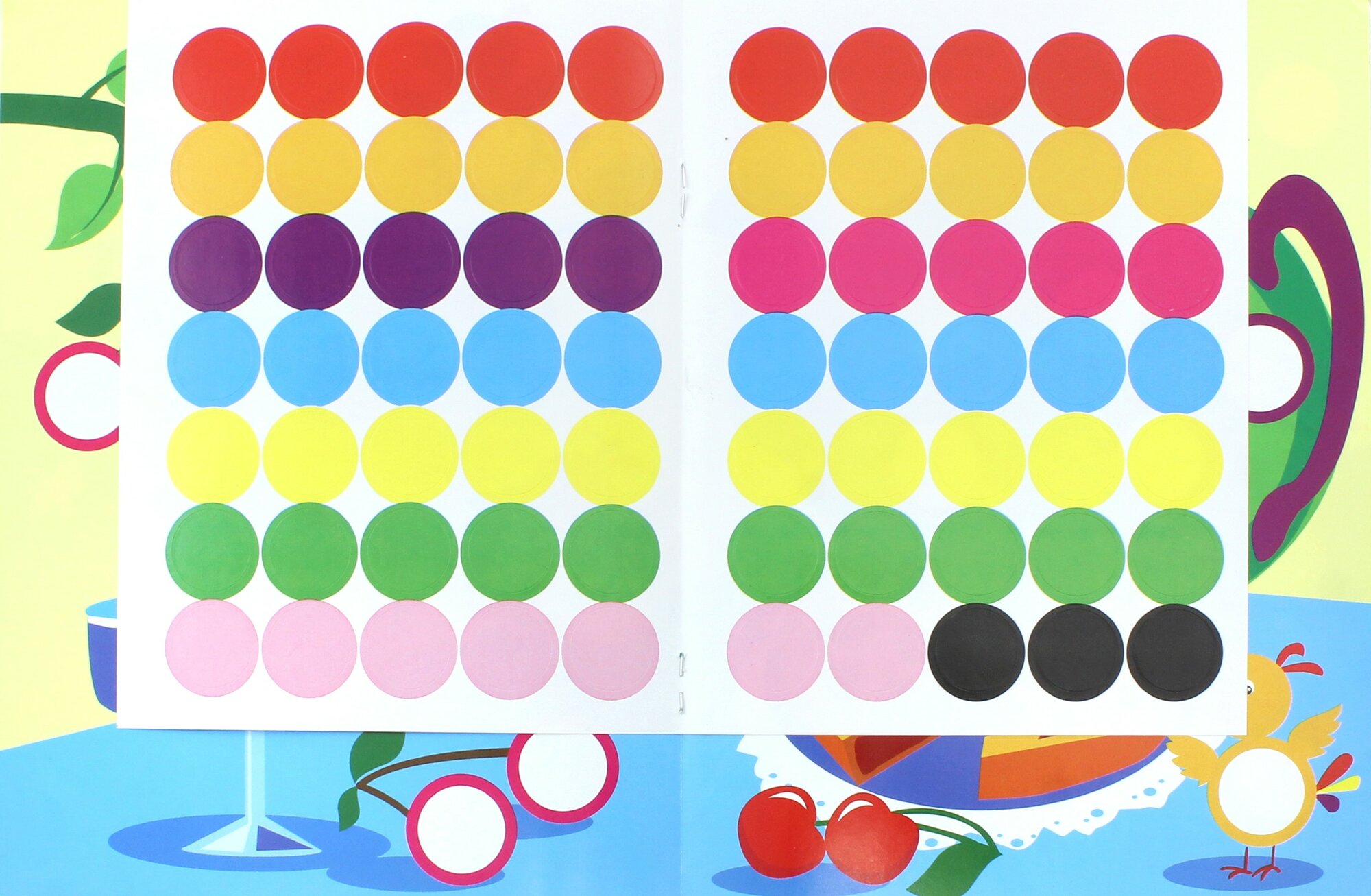Книжка с комплектом разноцветных наклеек-кружочков поможет вашему малышу запомнить названия цветов и предметов, а также поспособствует развитию усидчивости, внимания и мелкой моторики.