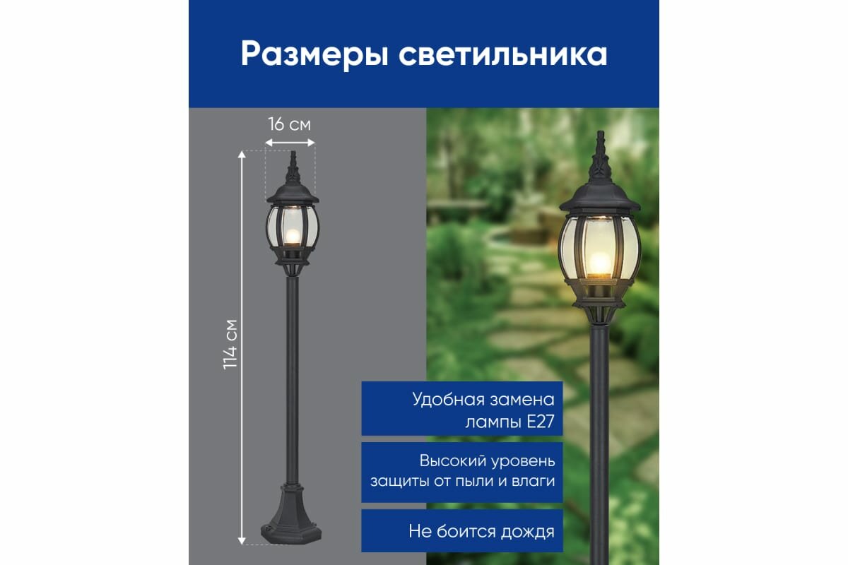 Уличный светильник Feron серии Классика. Будет прекрасным дополнением декора в вашем сада. Размеры 0.2x0.2x1.1 m. Параметры пылевлагозащиты IP — 44. Использует лампу с цоколем E27. Страна происхождения бренда — Россия.