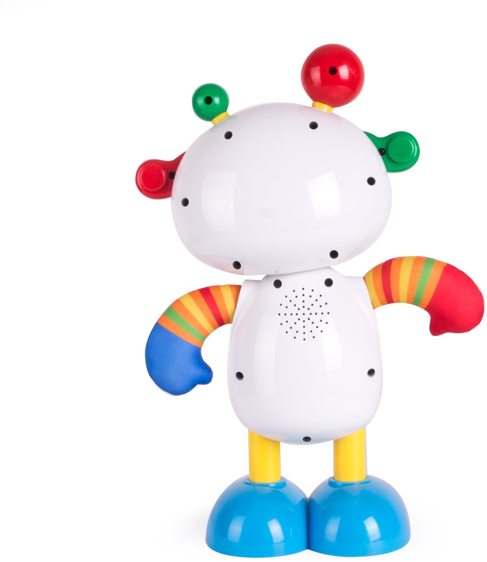 Интерактивный музыкальный с забавным лицом, разноцветными антеннами и туловищем, на котором расположены интерактивные кнопки. У игрушки подвижные голова, руки и туловище.