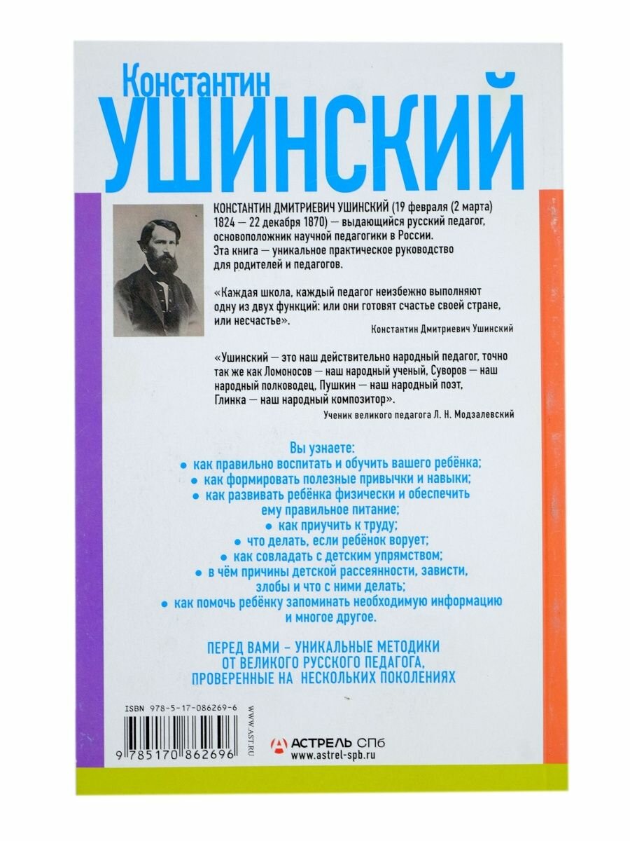 Отличная книга. В ней освещены актуальные вопросы воспитания и обучения ребенка. Интересно не только изложение позиций Ушинского, но и формулировки современного родителя, который задает тему, приводит реальный пример из современной жизни. Не жалею, что купила. Книга обязательно должна быть настольной в каждой семье с ребенком.
