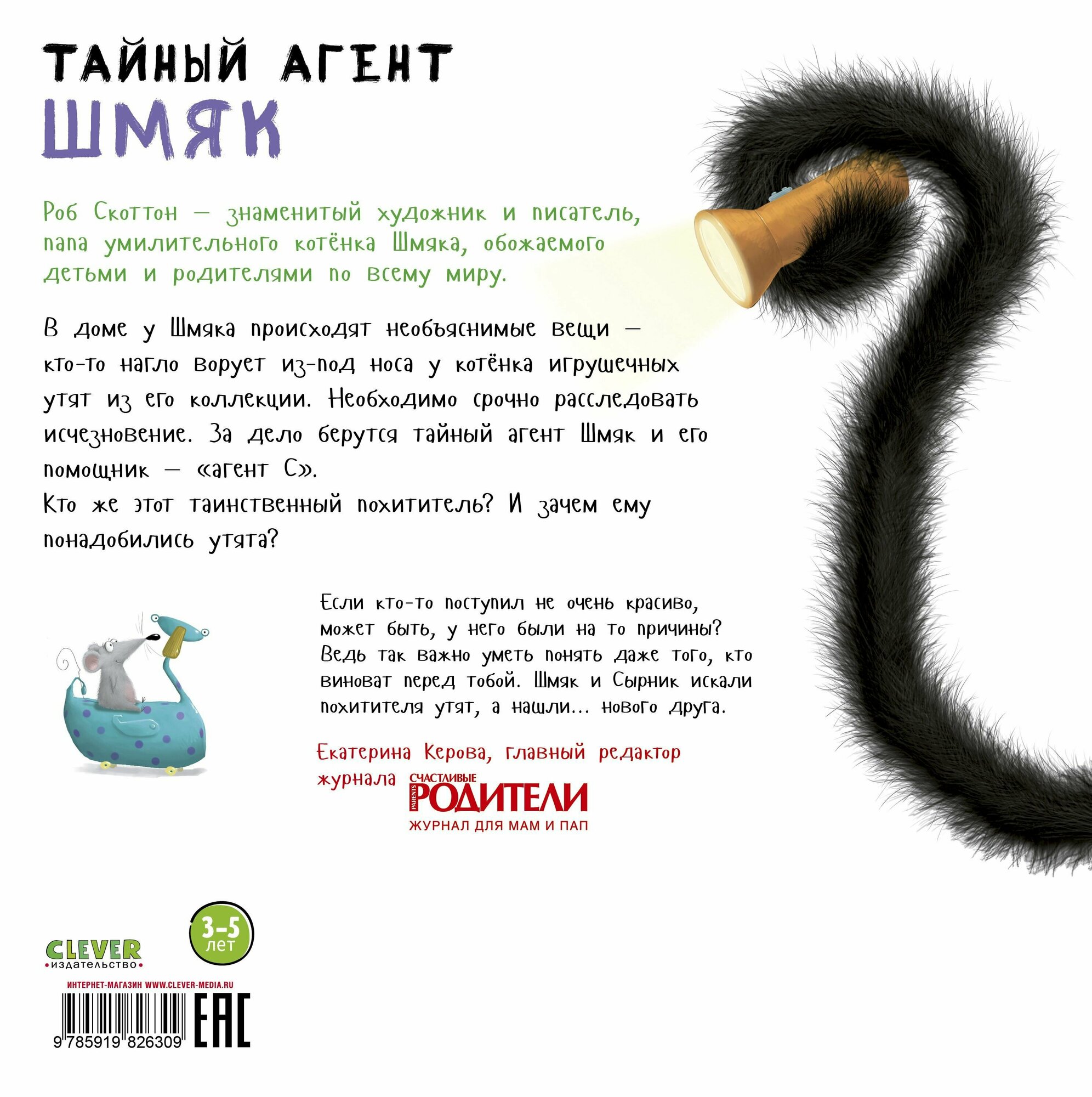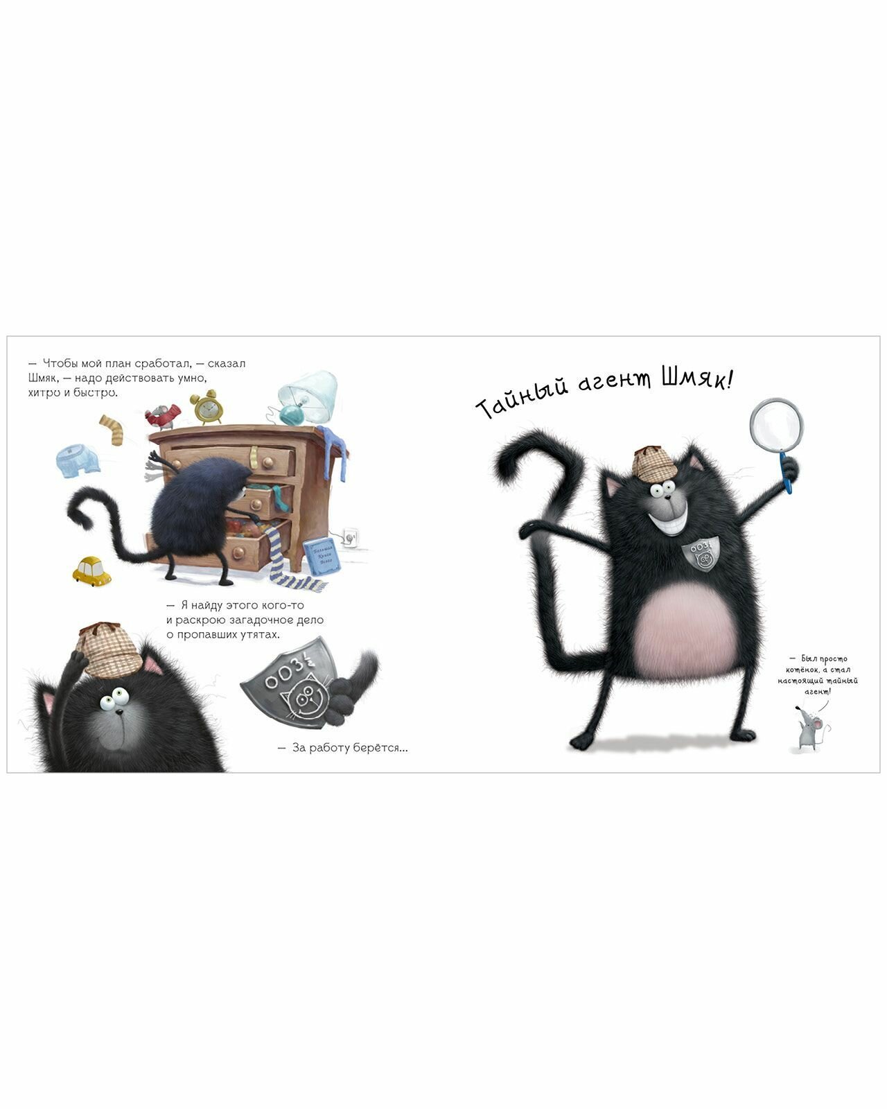 Роб Скоттон — знаменитый художник и писатель, папа умилительного котёнка Шмяка, обожаемого детьми и родителями по всему миру. В доме у Шмяка происходят необъяснимые вещи — кто-то нагло ворует из-под носа у котёнка игрушечных утят из его коллекции. Необходимо срочно расследовать исчезновение. За дело берутся тайный агент Шмяк и его помощник — «агент С». Кто же этот таинственный похититель? И зачем ему понадобились утята? Если кто то поступил не очень красиво, может быть, у него были на то причины? Ведь так важно уметь понять даже того, кто виноват перед тобой. Шмяк и Сырник искали похитителя утят, а нашли… нового друга.