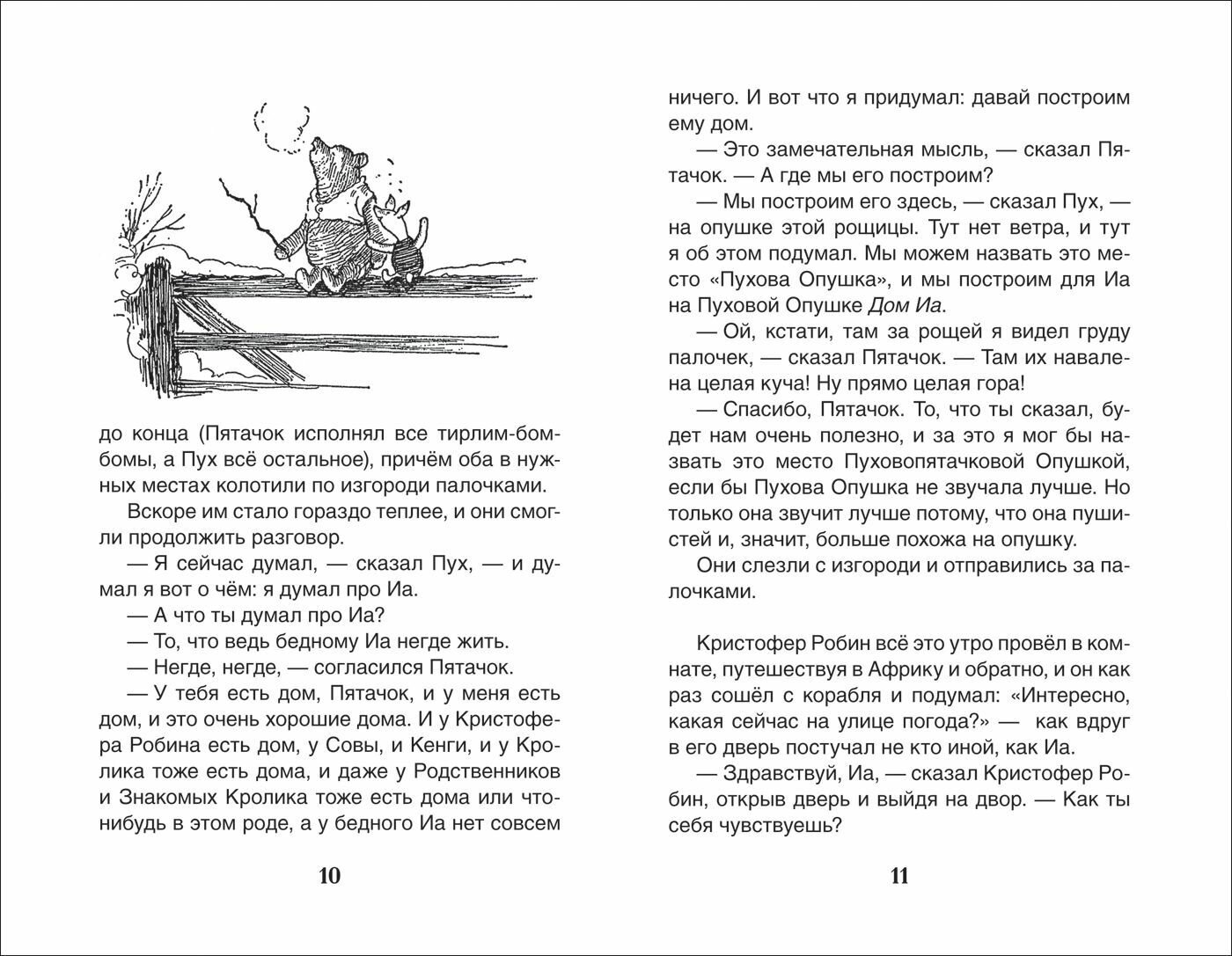 Это вторая повесть о забавном медвежонке по имени Винни-Пух, его друзьях и приключениях, которые происходят с ними в таинственном Зачарованном лесу. Иллюстрации классические, автор- Эрнест Хауард Шепард срисовал героев с сына автора и его игрушек, рисунки черно-белые, достаточно своеобразные, они совсем не похожи на привычные нам мультяшные изображения зверюшек. Книга для своей ценовой категории отличная.