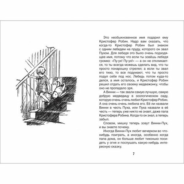 Винни-Пух, конечно, в представлении не нуждается. Что касается этого издания, то, с моей точки зрения, оно для тех, кто любит слушать и читать. Если вам нравятся книжки с красочными, выразительными или узнаваемыми по мультфильмам иллюстрациями, то эта книга не для вас. Картинки небольшие, черно-белые, хотя они считаются классическими, лично для меня они невыразительные. Но мы специально покупаем разные книжки, чтобы понимать отличие при разном взгляде на одну и туже историю. а ещё мы с ребенком любим именно читать, поэтому иллюстрации для нас порой вторичны. а текст замечательный. Шрифт достаточно крупный, переплёт твердый. такую книгу удобно брать с собой в дорогу.