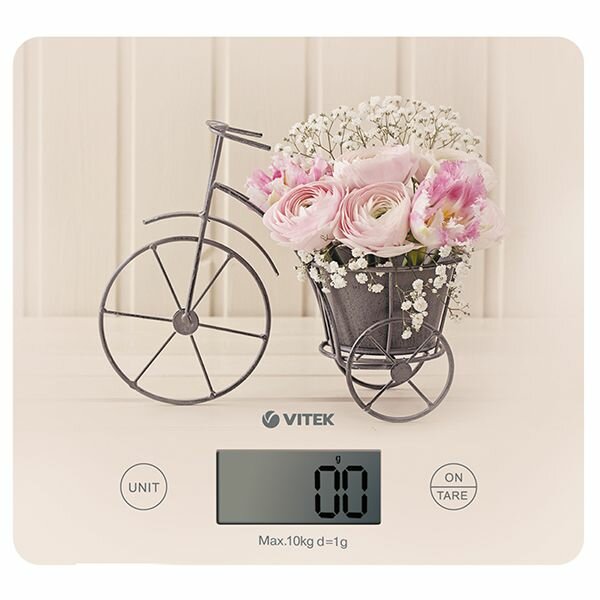 Кухонные весы Vitek – природное дыхание французской глубинки. Стильная кованая подставка с нежными цветами изображена на светлой платформе из закаленного стекла, такое сочетание отображает один из самых популярных стилей – Прованс. Преимущества весов: полезная и удобная функция тарирования (определение веса тары), функция последовательного взвешивание. Максимальный вес взвешиваемых продуктов - 10 кг.