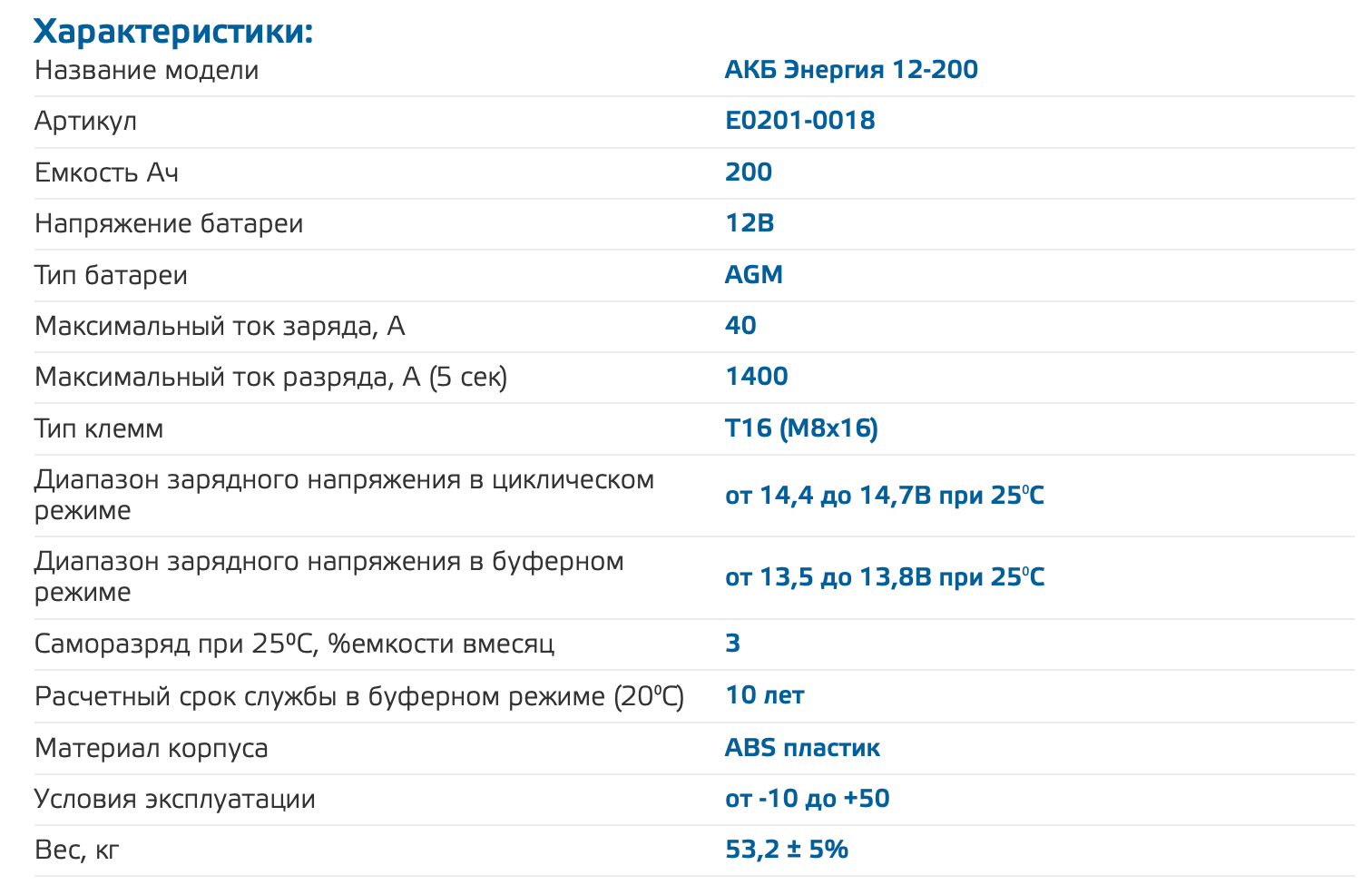 | Заряд (циклический режим) | от 14,5 до 15,5 В при 25⁰С |