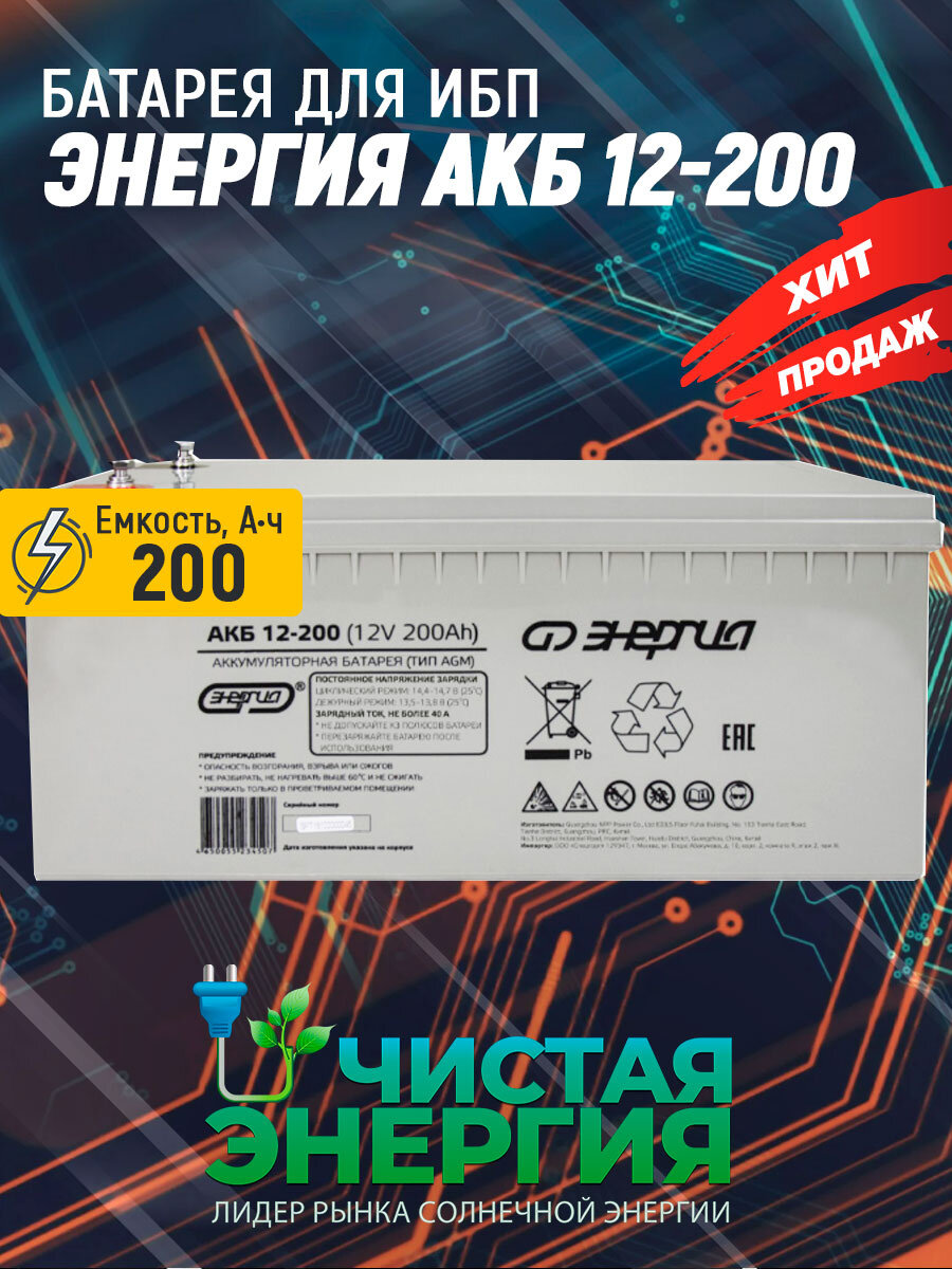 Аккумулятор для ИБП Энергия АКБ 12-200 создан специально для работы в буферном режиме эксплуатации. Идеально подходит для работы в устройствах бесперебойного электропитания, охранной сигнализации, информационных и телекоммуникационных системах и других типах оборудования.