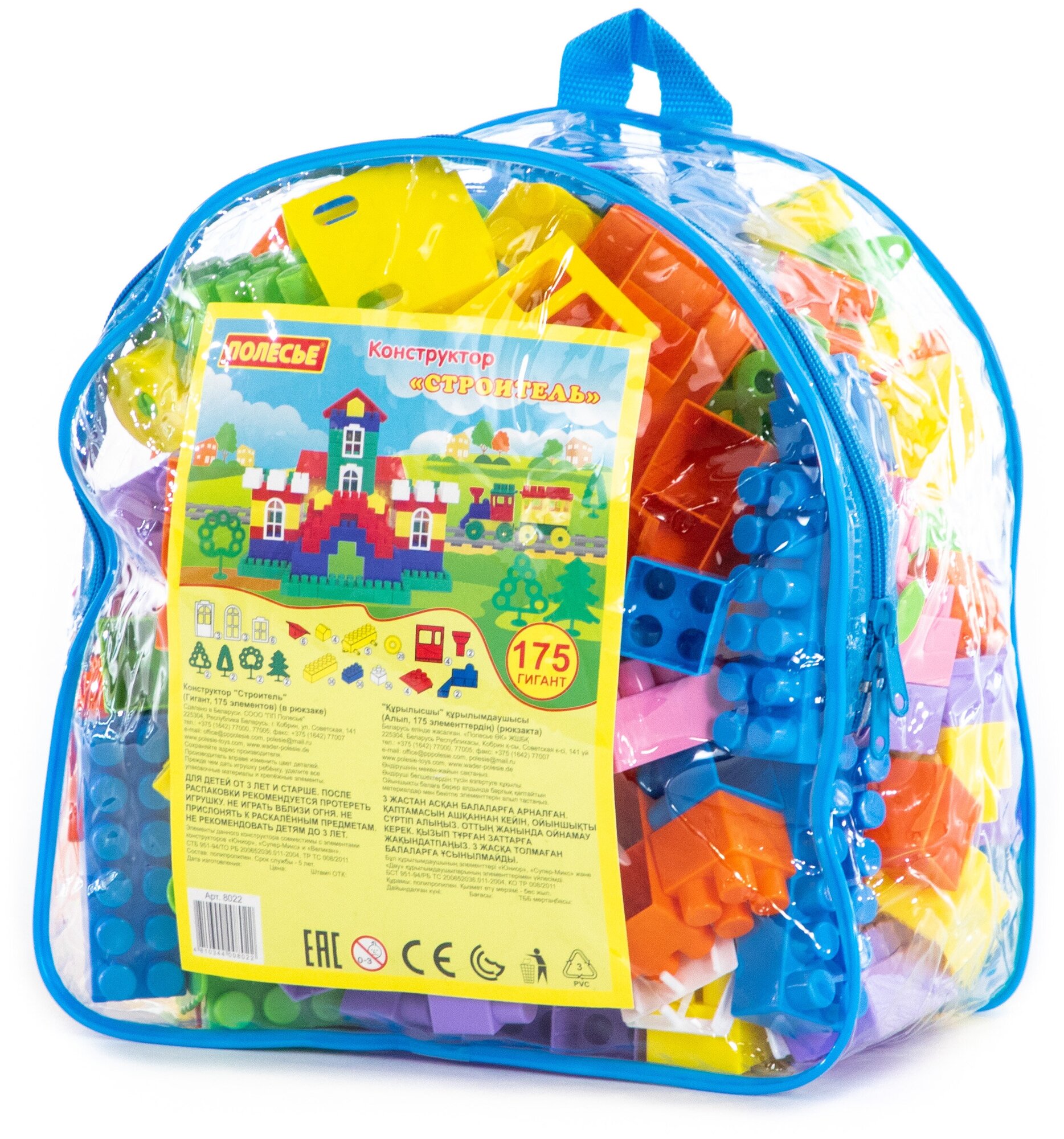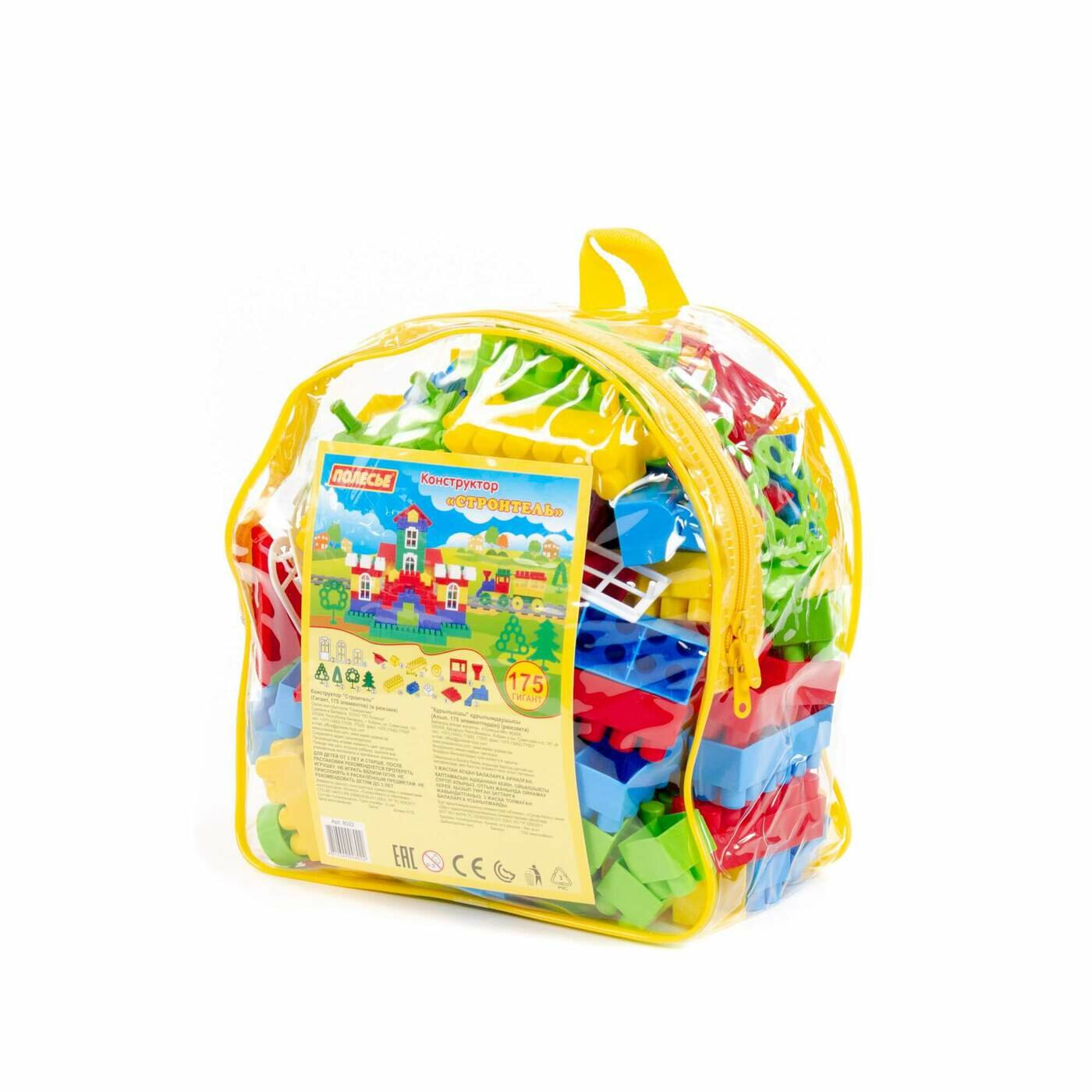 Конструктор Строитель - настоящий Гигант! Он состоит из 175 крупных деталей ярких цветов, из которых можно собирать простые фигуры. Все элементы изготовлены из высококачественных материалов, не токсичных и не вызывающих аллергии. Упакованы детали в удобный прозрачный рюкзак.