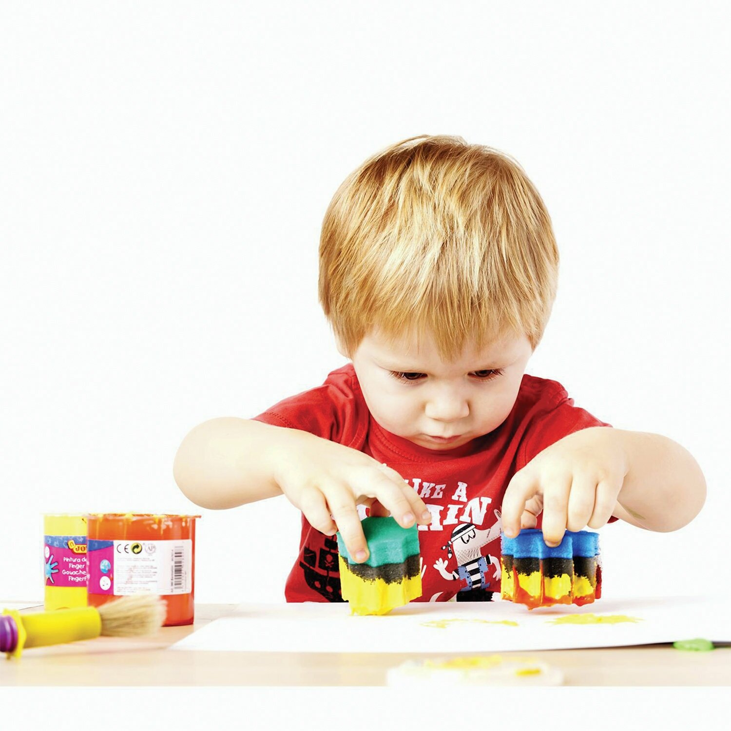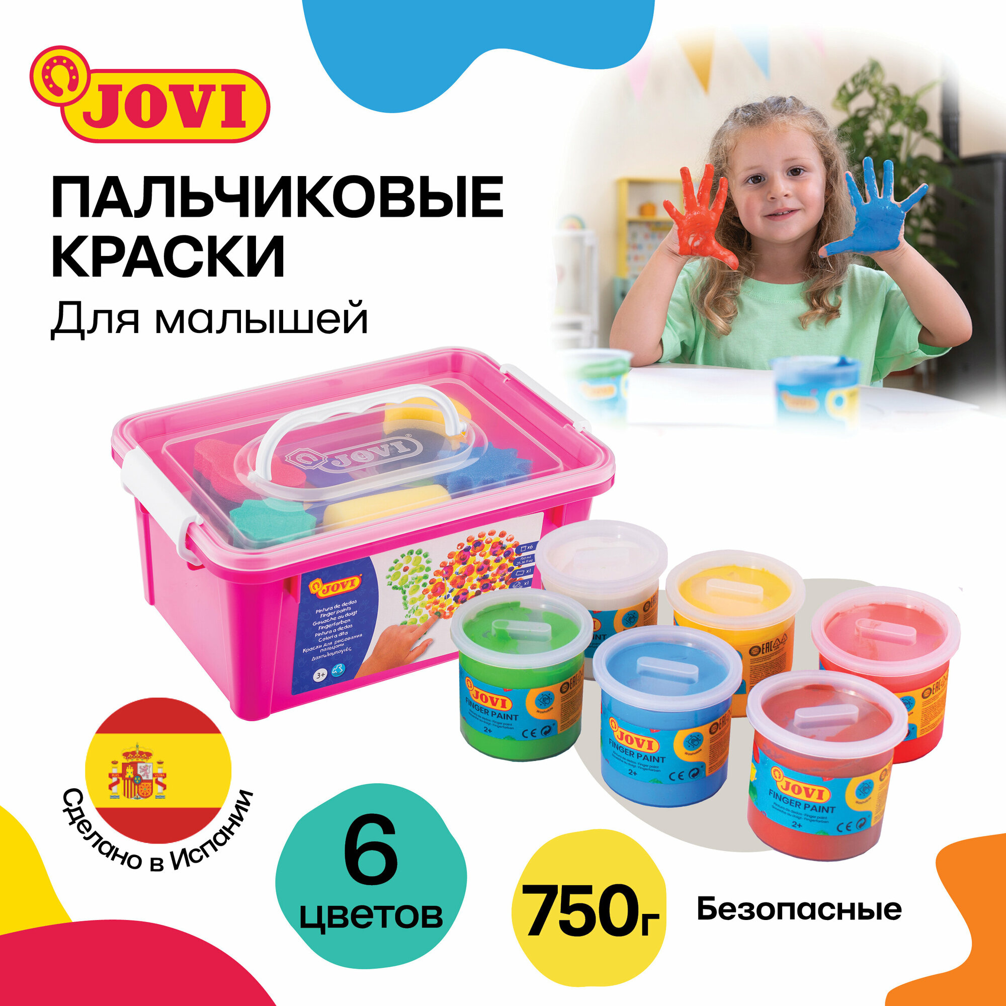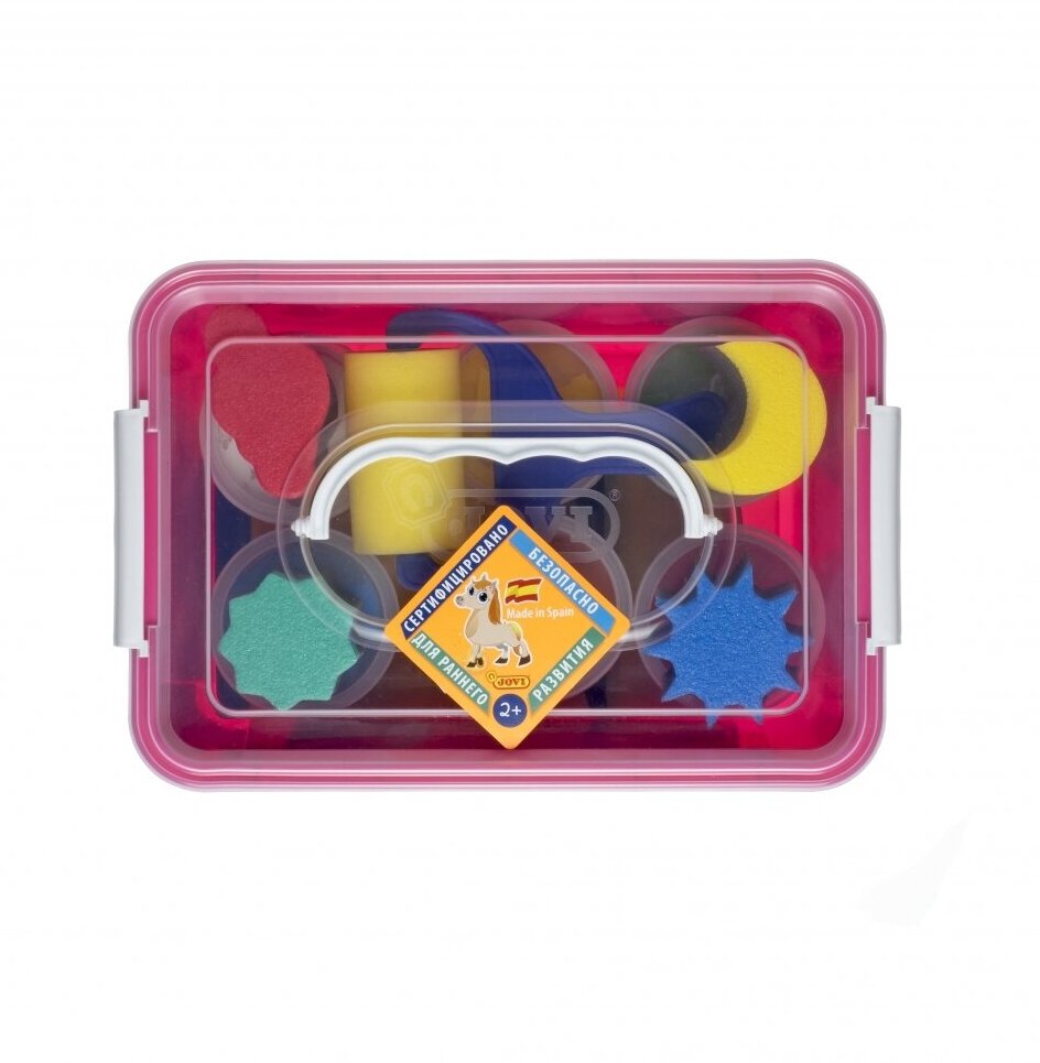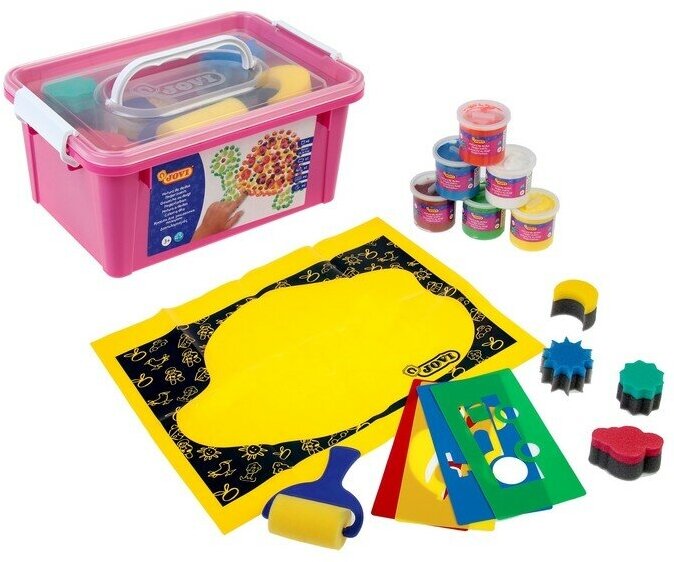 Большой набор красок и аксессуаров JOVI для рисования руками в пластиковом чемоданчике - это настоящий подарок для вашего малыша. Обратите внимание, что товар сертифицирован для детей от 2х лет! Набор составлен специально для первых опытов рисования с учетом возможностей ребенка раннего возраста. Набор упакован в удобный пластиковый чемоданчик-бокс с ручкой для переноски. Все аксессуары: клеенка, валик, штампы и трафареты - многоразовые, после применения легко моются в теплой воде. Каждая краска в наборе запечатана в пластиковую баночку объемом 125 мл и закрыта плотной крышечкой. Благодаря широкой баночке и очень густой консистенции, похожей на желе, краски JOVI удобно набирать в детскую ладошку и смешивать между собой. Особенно это важно для создания новых цветов. Расход красок экономичный. А если юный Малевич случайно опрокинет баночку, ее содержимое не вытечет. Последствия бурной творческой деятельности тоже будут минимальными - краски на водной основе, поэтому легко смываются с рук ребенка теплой водой. А для удаления краски с одежды подойдет обычный режим стирки при самой низкой температуре и без применения каких-либо пятновыводителей.