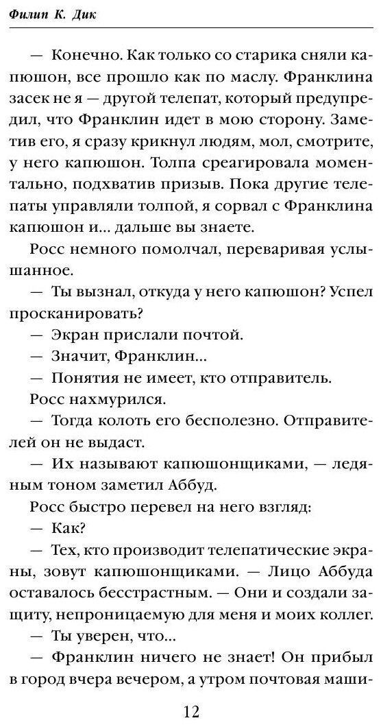 До этой книги, наверное, ни разу не читал сборников рассказов (разве что хрестоматии в школе), и не думал, что прочту вообще, но предполагаю, что этот сборник станет моим последним сборником рассказов. Не люблю я формат коротких произведений, ну что ж поделаешь ¯\_(ツ)_/¯ К Дику никаких претензий нет, он как всегда великолепен, но отторжение вызывает именно этот формат, особенно в таком варианте: большие поля, крупный шрифт. Хоть книга и кажется среднего формата, читается очень быстро, буквально за 3-4 часа при средней скорости. Оно и понятно - растянуть десять рассказов на три с лишним сотни страниц иначе никак. Радует, что хотя бы на качестве не сэкономили: бумага толстая и белая, шрифт чёткий и контрастный. Хорошо подойдёт для детей, начинающих своё знакомство с фантастикой или для людей, имеющих проблемы со зрением