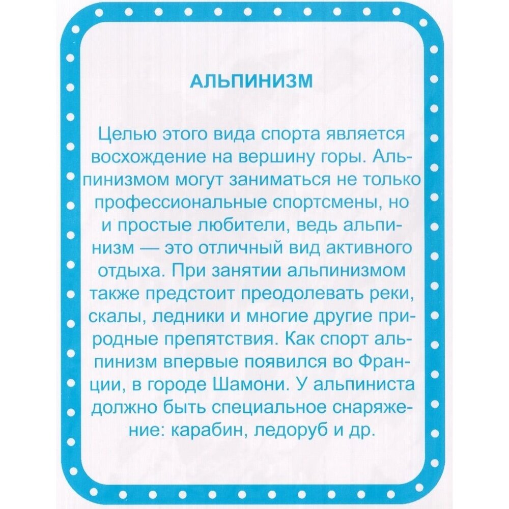 Хорошие карточки: Много видов спорта, большой формат, на обороте подробно описано что за вид спорта, основные особенности.