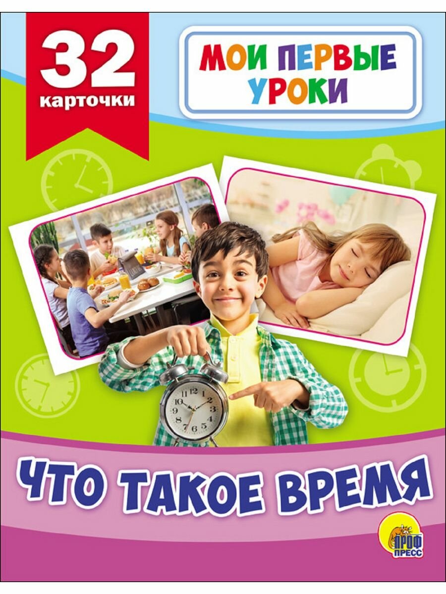Очень полезная и увлекательная серия развивающих карточек «Мои первые уроки». В данном наборе 32 плотные карточки, которые помогают понять ребенку, что такое время, как его определять. Подойдут для дошкольного и младшего школьного возраста. Иллюстрации четкие, яркие, легко воспринимаются ребенком. Так как карточки крупные, то их удобно разглядывать и держать в руках