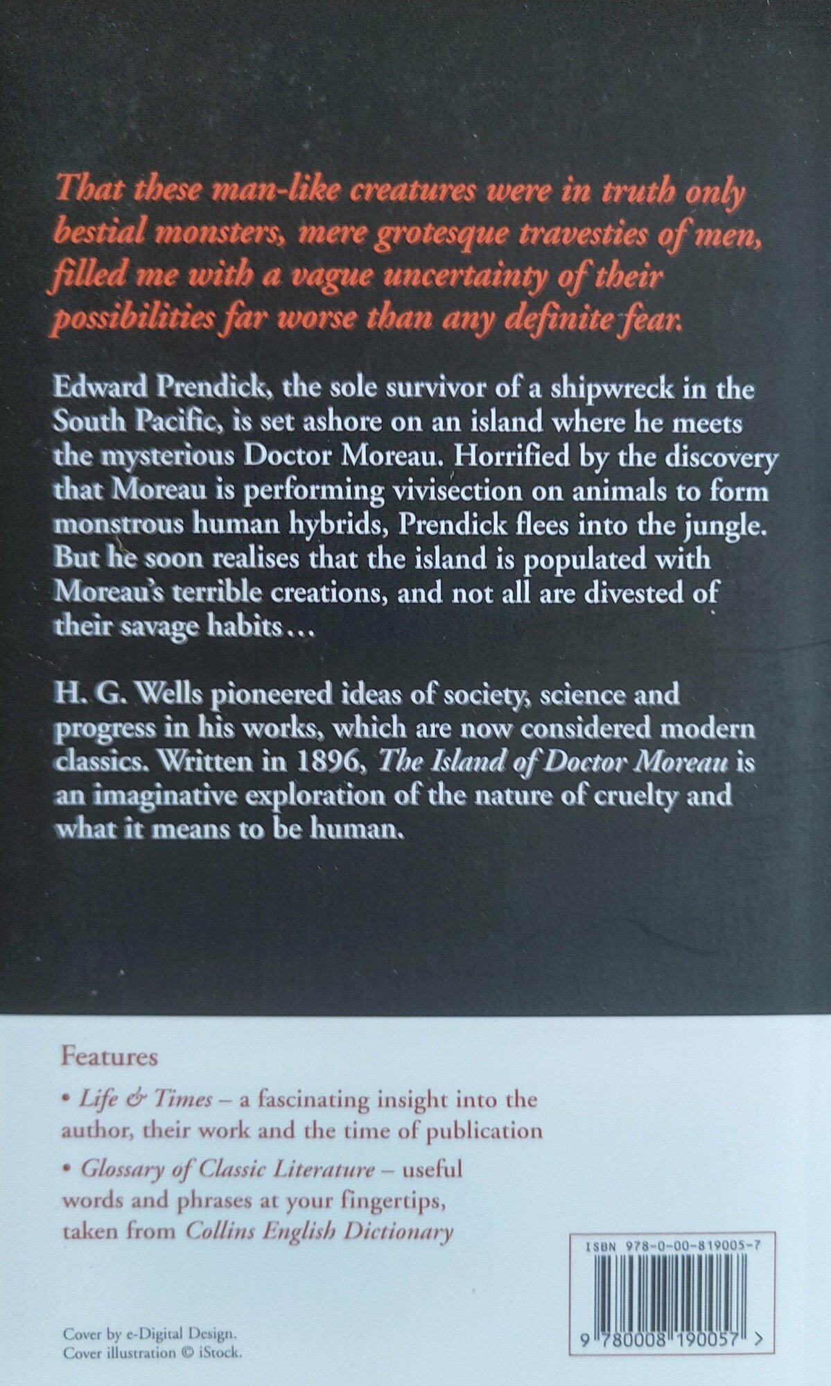 HarperCollins is proud to present its incredible range of best-loved, essential classics. “That these man-like creatures were in truth only bestial monsters, mere grotesque travesties of men, filled me with a vague uncertainty of their possibilities far worse than any definite fear.” Edward Prendick, the sole survivor of a shipwreck in the South Pacific, is set ashore on an island where he meets the mysterious Doctor Moreau. Horrified by the discovery that Moreau is performing vivisection on animals to form monstrous human hybrids, Prendick flees into the jungle. But he soon realises that the island is populated with Moreau’s terrible creations, and not all are divested of their savage habits . . . H. G. Wells pioneered ideas of society, science and progress in his works, which are now considered modern classics. Written in 1896, The Island of Doctor Moreau is an imaginative exploration of the nature of cruelty and what it means to be human.