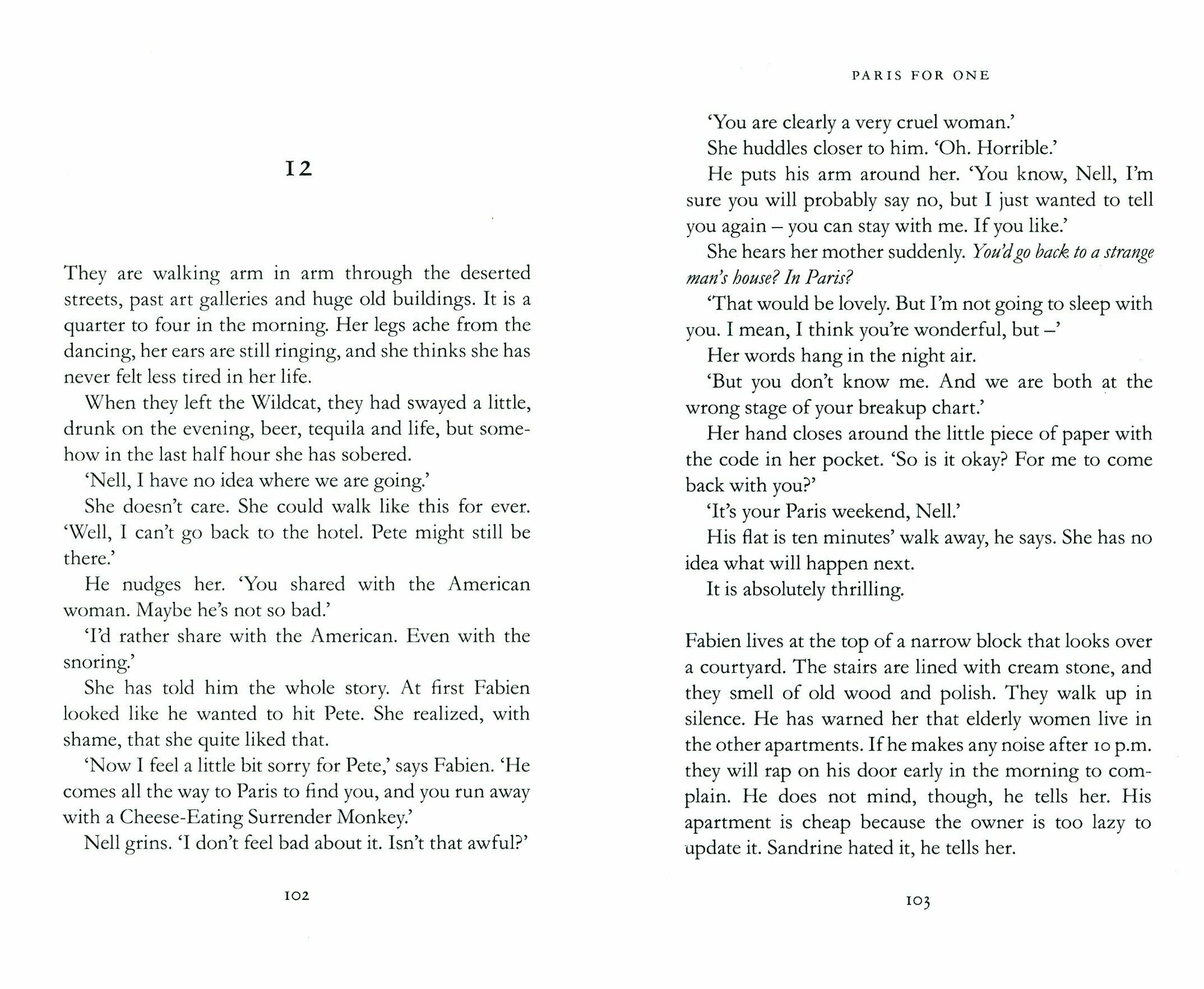 Прекрасная книга, очень легко читается (для уровня B2). Примерно треть книги составляет новелла "Paris for One", остальная часть - это небольшие, но очень интересные и захватывающие рассказы. Самое примечательное - в конце книги после благодарностей есть отрывок первой главы следующей книги JoJo Moyes "Still me". Вопросов о том, какую книгу заказывать следующей теперь нет)
