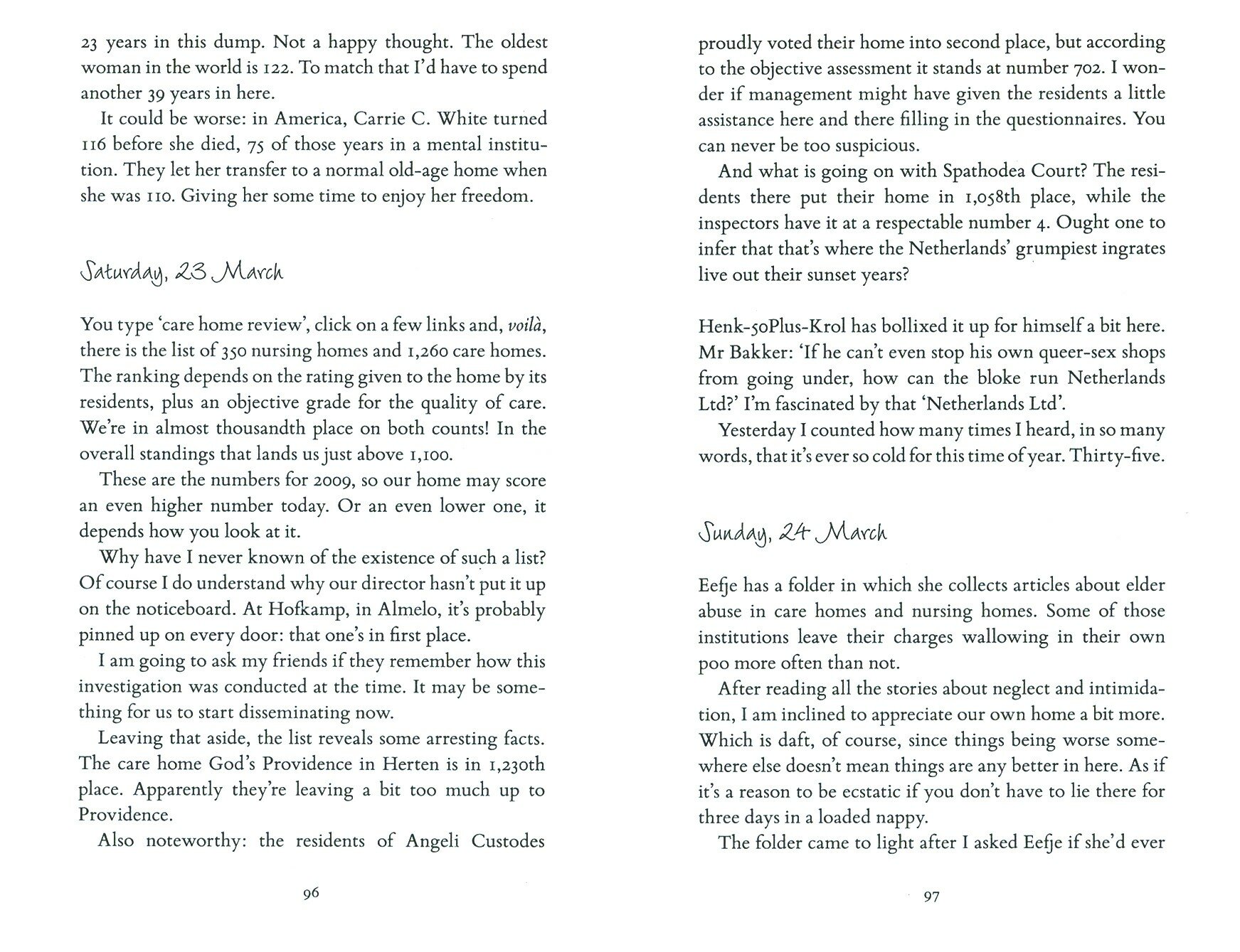 В дневнике Хендрика есть все то, что мы все хотели бы сказать и сделать. Он и его соратник Эверт регулярно подливают масла в огонь, высказывая вслух все эти язвительные и мелочные мысли. И, возможно, в свои 83 и 1/4 года он заслужил это право. Между глупыми правилами и сварливыми обитателями дома престарелых Хендрику есть, чем развлечься и от чего смутиться. Три «G» (gossip, grousing, gibberish – сплетни, ворчание и тарабарщина) делают его дни интересными. Читая дневник Хендрика, испытываешь целую гамму эмоций: радость, грусть, слезы на глазах, смех. Мне очень понравилось его разоблачение, оно наполнено забавными и глубокими историями о старении и жизни в целом, с отличным словарным запасом в придачу.