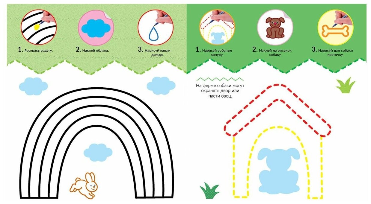 Эта книга о жизни на ферме и её обитателях. С нею ты научишься рисовать, раскрашивать и аккуратно приклеивать наклейки. А ещё узнаешь много интересного! На каждой странице — если постараешься — у тебя получится маленький шедевр, для этого достаточно выполнить три простых шага — и готово! Книга со множеством весёлых заданий стимулирует развитие детей раннего возраста. Интересные и познавательные игры учат детей считать, развивают мелкую моторику, а также знакомят малышей с формами и цветами.