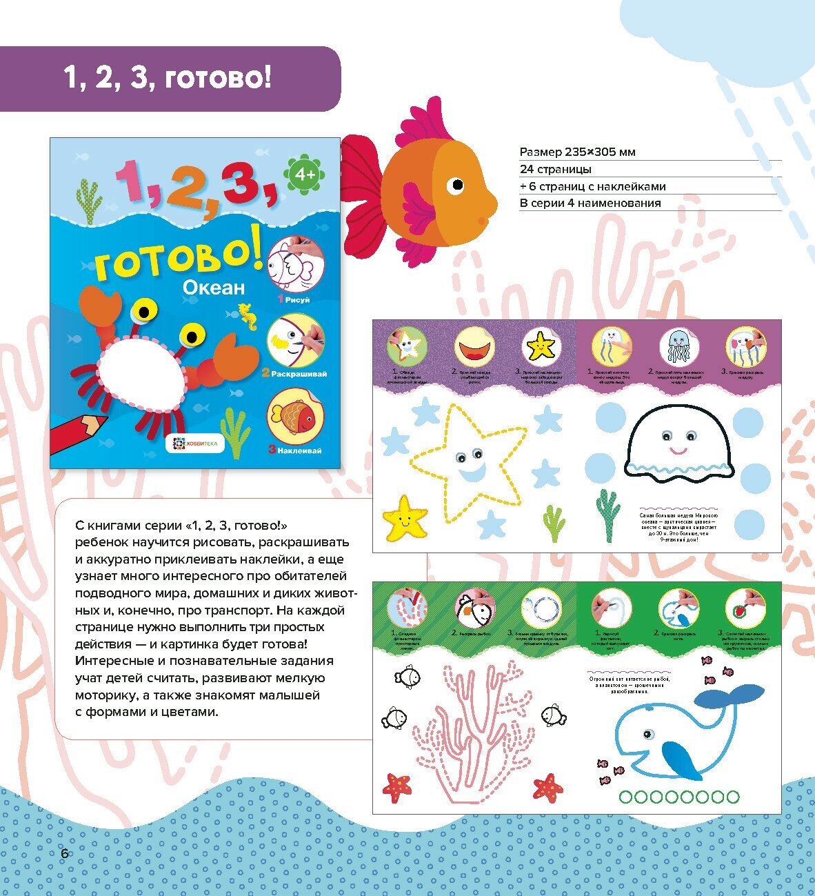 Эта книга про обитателей подводного мира. С нею ты научишься рисовать, раскрашивать и аккуратно приклеивать наклейки. А ещё узнаешь много интересного! На каждой странице — если постараешься — у тебя получится маленький шедевр, для этого достаточно выполнить три простых шага — и готово! Книга со множеством весёлых заданий стимулирует развитие детей раннего возраста. Интересные и познавательные игры учат детей считать, развивают мелкую моторику, а также знакомят малышей с формами и цветами.
