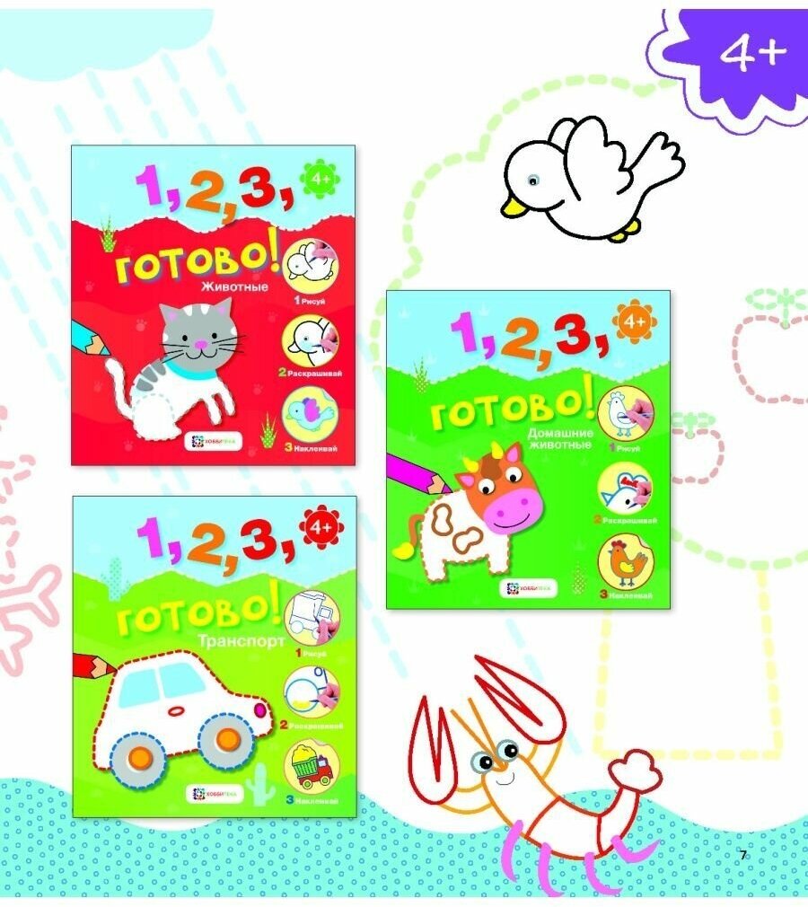Эта книга про животных, насекомых и птиц. С нею ты научишься рисовать, раскрашивать и аккуратно приклеивать наклейки. А ещё узнаешь много интересного! На каждой странице — если постараешься — у тебя получится маленький шедевр, для этого достаточно выполнить три простых шага — и готово! Книга со множеством весёлых заданий стимулирует развитие детей раннего возраста. Интересные и познавательные игры учат детей считать, развивают мелкую моторику, а также знакомят малышей с формами и цветами.