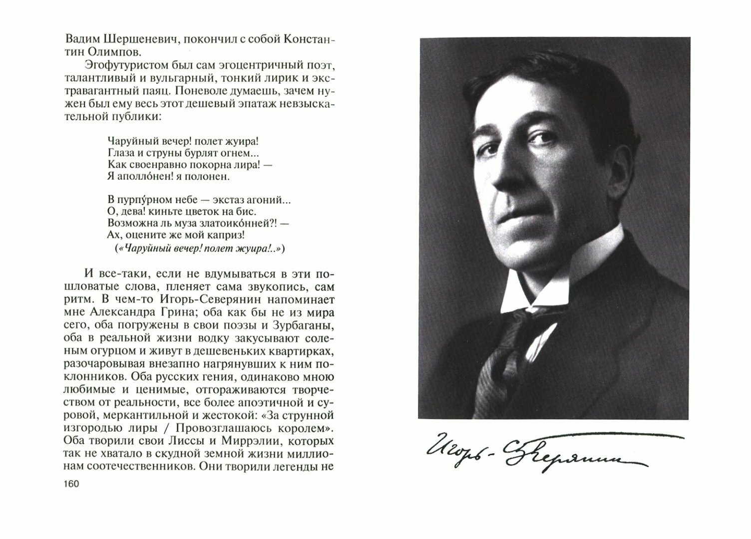 Это как раз тот случай, когда большой любитель пишет рассказ о своем любимом авторе. И то, что он любитель Бондаренко вовсе не скрывает. Да, он проделал большую работу, много поездил по местам жизни своего кумира, много с кем встречался, был в архивах. Но как не крути, получилась просто интересная авторская книга, на 80% книга - цитата, от автора там практически ничего нет. Да он к этому и не стремился.При всем при этом,весь материал грамотно скомпанован, автору удалось затронуть все основные стороны жизни и деятельности поэта, с чувством, тактом и расстановкой передать основные мотивы его творчества, казусы и перепетии личной жизни и общественные взгляды. С учетом отсутствия (а лучше сказать -крайней малочисленности ) биографий Северянина - данная книга вполне удачный старт на этом поприще. Стоит заметить, что автор очень высоко оценивает другую монографию о поэте авторства Шубниковой -Гусевой и Терехиной, также изданную в ЖЗЛ, и именно ее считает единственной научной работой о жизни и деятельности Северянина.