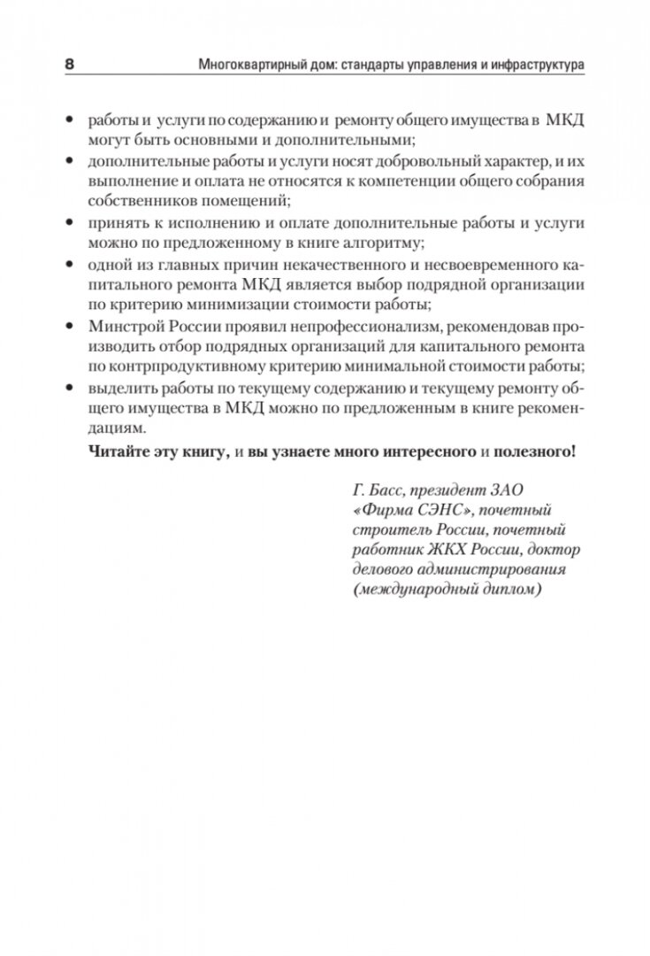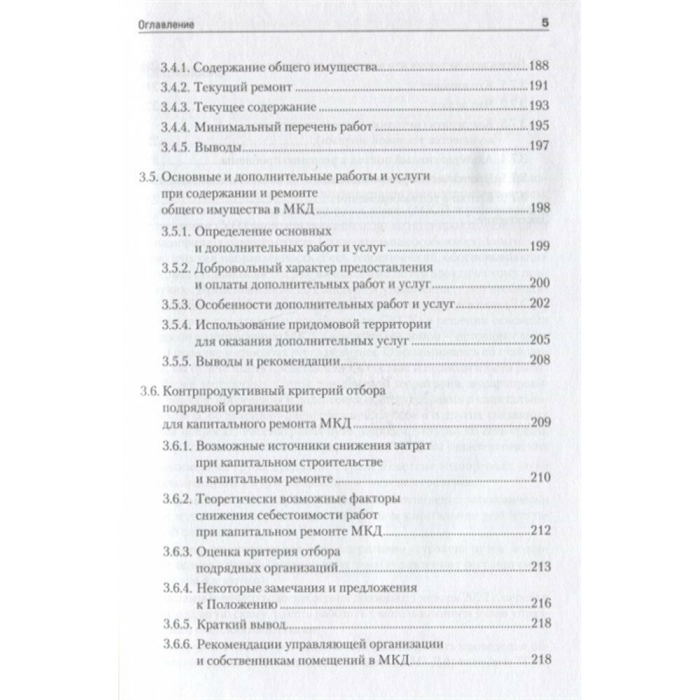 Подробно рассмотрены используемые при капитальном ремонте материалы и новое оборудование, представлены предложения по ликвидации перетопов и переплаты за тепло, определены признаки и особенности основных и дополнительных работ по содержанию общего имущества в МКД, уточнен порядок инициирования и проведения общего собрания собственников помещений и членов ТСЖ, критически рассмотрено предложенное Минстроем РФ положение о критерии отбора подрядных организаций для выполнения работ по капитальному ремонту МКД.