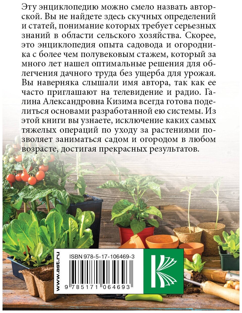 Эту энциклопедию можно смело назвать авторской. Вы не найдете здесь скучных определений и статей, понимание которых требует серьезных знаний в области сельского хозяйства. Скорее, это энциклопедия опыта садовода и огородника с более чем полувековым стажем, который за много лет нашел оптимальные решения для облегчения дачного труда без ущерба для урожая. Вы наверняка слышали имя автора, так как ее часто приглашают на телевидение и радио. Галина Александровна Кизима всегда готова поделиться основами разработанной ею системы. Из этой книги вы узнаете, исключение каких самых тяжелых операций по уходу за растениями позволяет заниматься садом и огородом в любом возрасте, достигая прекрасных результатов.