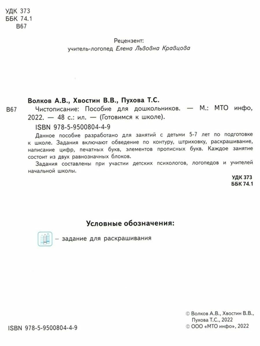 Чистописание для дошкольников (Волков Александр Вячеславович, Хвостин Владимир Владимирович, Пухова Татьяна Сергеевна); МТО Инфо, 2020