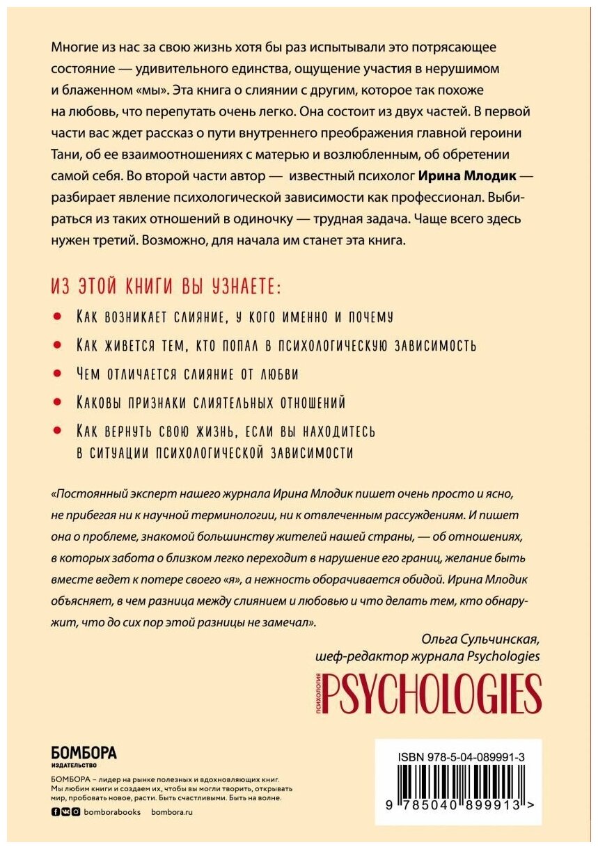 Многие из нас за свою жизнь хотя бы раз испытывали это потрясающее состояние - удивительного единства, ощущения участия в нерушимом и блаженном "мы". Эта книга о слиянии с другим, которое так похоже на любовь, что перепутать очень легко. Она состоит из двух частей. В первой части вас ждет рассказ о пути внутреннего преображения главной героини Тани, о ее взаимоотношениях с матерью и возлюбленным, об обретении самой себя. Во второй части автор - известный психолог Ирина Млодик - разбирает явление психологической зависимости как профессионал. Выбираться из таких отношений в одиночку - трудная задача. Чаще всего здесь нужен третий. Возможно, для начала им станет эта книга.