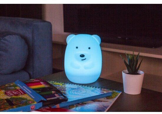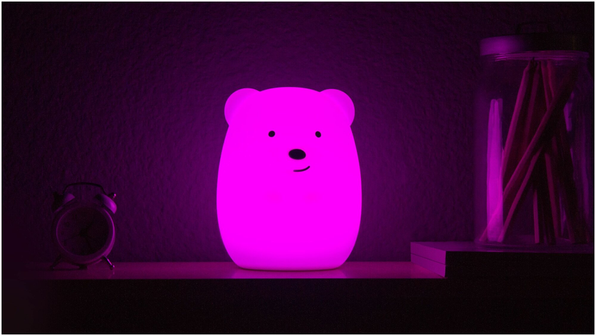 Очаровательный медвежонок, меняет цвет освещения. Можно настроить "дыхание", то есть поочередная смена цветов будет, можно зафиксировать любой по настроению, можно оставить светлый спокойный. Долго держит заряд, на неделю точно хватает