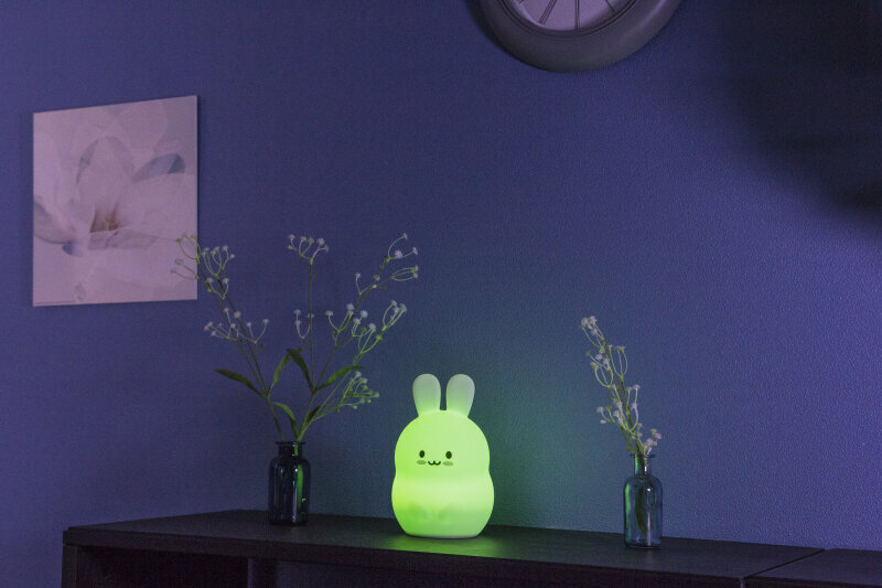 **Светильник детский Rombica LED Rabbit** работает на литий-йодном аккумуляторе, который при минимальных размерах имеет сравнительно большую ёмкость и увеличенный срок службы. Данный тип аккумулятора требует меньше циклов заряда, а уровень разряда светильника достаточно низкий. Удобная плата нового типа для подключения кабеля зарядки. LED диоды с защитой для глаз, что важно при использовании в детских. Светильник сделан из качественного силикона.