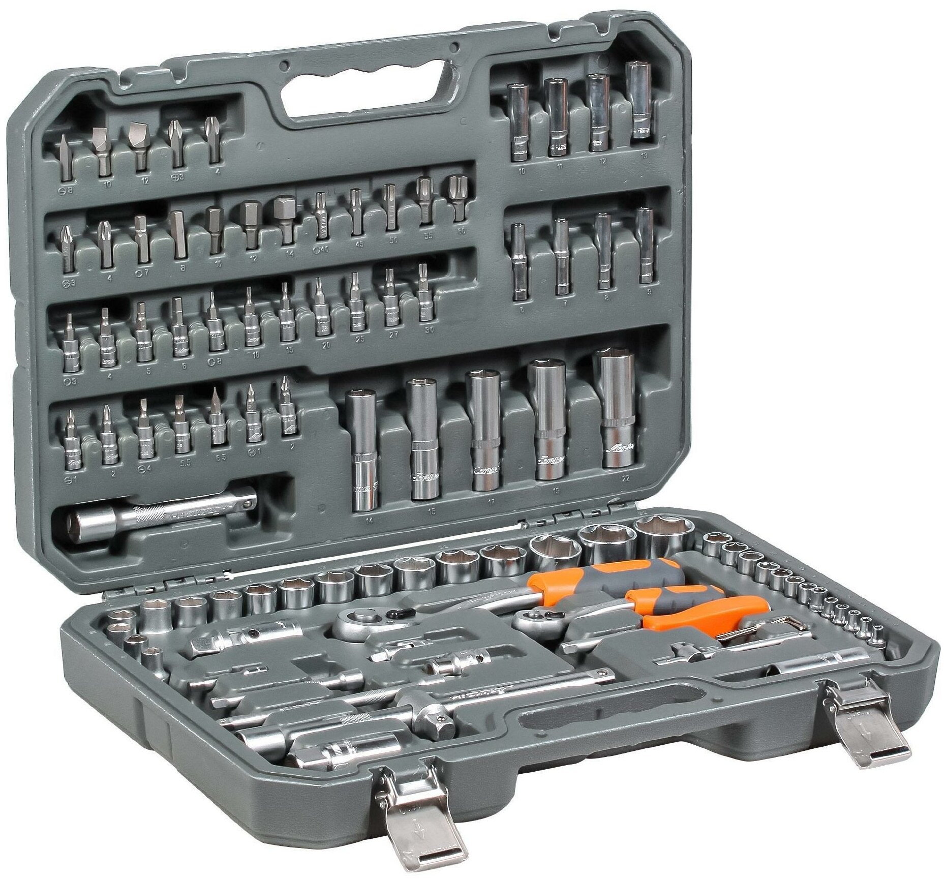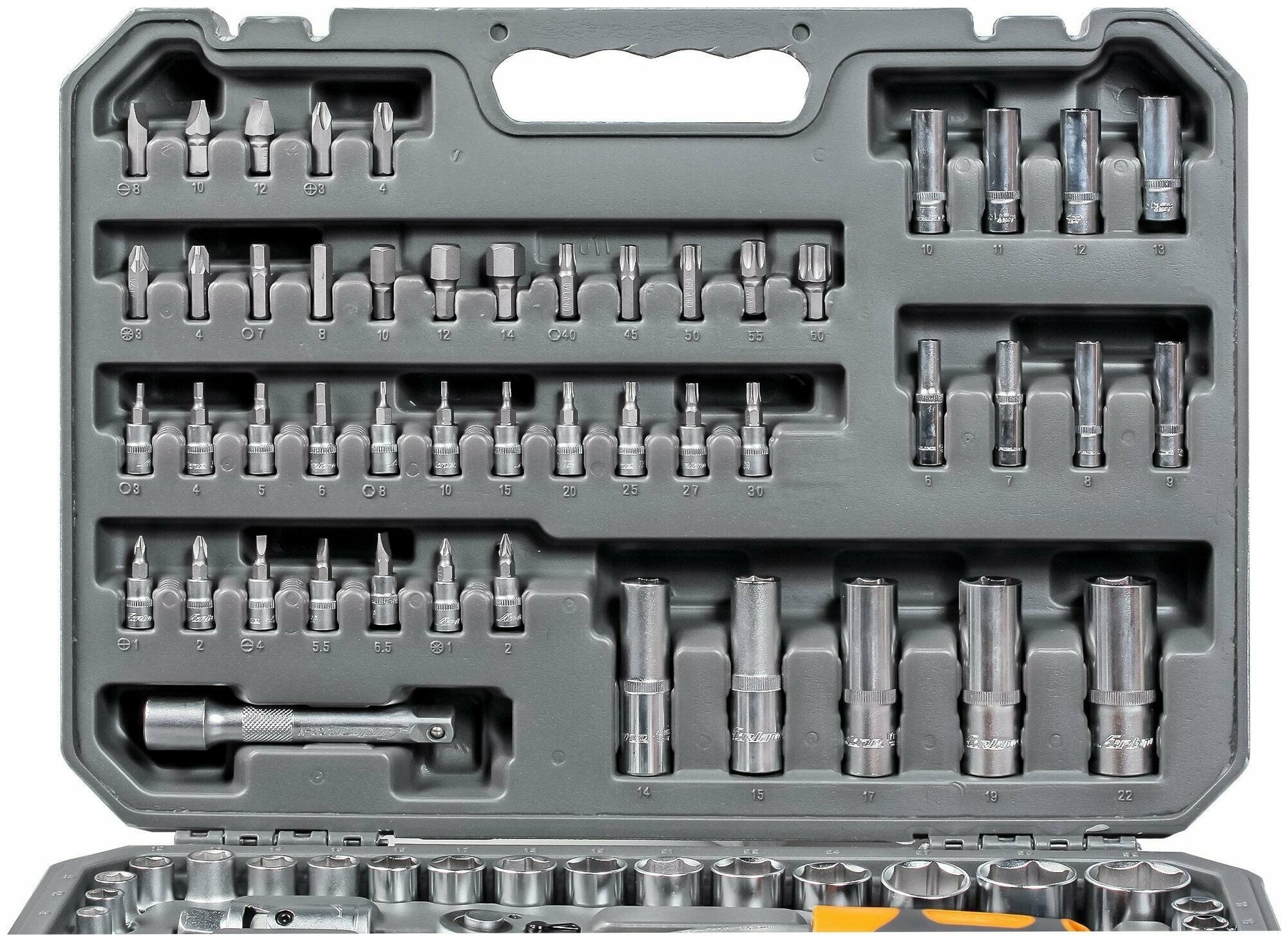 | Головки торцевые подробно | 1/4"4, 4.5, 5, 5.5, 6, 7, 8, 9, 10, 11, 12, 13, 14 мм; длинные 1/4"6, 7, 8, 9, 10, 11, 12, 13 мм; трещотка 1/4"72 зуба; вороток т-образный 1/4"; удлинитель 1/4"50, 100, 150 мм; карданный шарнир 1/4"; гибкий удлинитель 1/4"145 мм; с битами 1/4"TX8, TX10, TX15, TX20, TX25, TX27, TX30, H3, H4, H5, H6, SL4, SL5.5, SL6.5, PH1, PH2, PZ1, PZ2; 1/2"8, 10, 11, 12, 13, 14, 15, 16, 17, 18, 19, 21, 22, 24, 27, 30, 32 мм; длинные 1/2"14, 15, 17, 19, 22 мм; удлинитель 1/2"125, 250 мм; карданный шарнир 1/2"; трещотка 1/2"72 зуба; свечные 1/2"16, 21 мм |