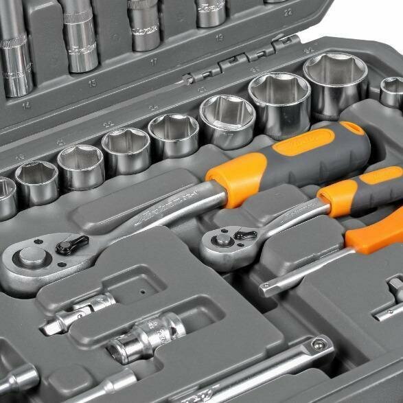| Комплектация | 1. 1/4" Головка торцевая 6гр. 4, 4.5, 5, 5.5, 6, 7, 8, 9, 10, 11, 12, 13, 14 Головка торцевая удлиненная 6гр. 6, 7, 8, 9, 10, 11, 12, 13 Трещёточная рукоятка 1/4", 72 зуба Вороток Т-образный 1/4" Отвёрточная рукоятка 1/4" - 1/4" Удлинитель 50мм, 100мм, 150мм Карданный шарнир 1/4" Г-образный шестигранный ключ 1.5мм, 2мм, 2.5мм Биты в держателе 1/4" TX8, TX 10, TX 15, TX 20, TX 25, TX 27, TX 30, H3, H4, H5, H6, SL 4, SL 5.5, SL 6.5, PH 1, PH 2, PZ 1, PZ 22. 1/2" Биты 8мм H7, H8, H10, H12, H14, SL 8, SL 10, SL 12, PH 3, PH 4, PZ 3, PZ 4, TX 40, TX 45, TX 50, TX 55, TX 60 Головка торцевая 6гр. 8, 10, 11, 12, 13, 14, 15, 16, 17, 18, 19, 21, 22, 24, 27, 30, 32 Головка торцевая удлиненная 6гр. 14, 15, 17, 19, 22 Головка свечная 16мм, 21мм Трещёточная рукоятка 1/2", 72 зуба Держатель для бит 1/2" - 8мм Удлинитель 125мм, 250мм Адаптор для Т-образного воротка 1/2" Карданный шарнир 1/2" |