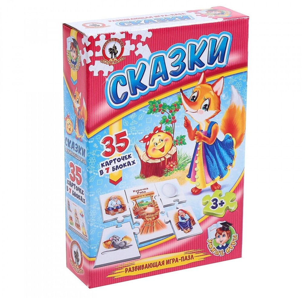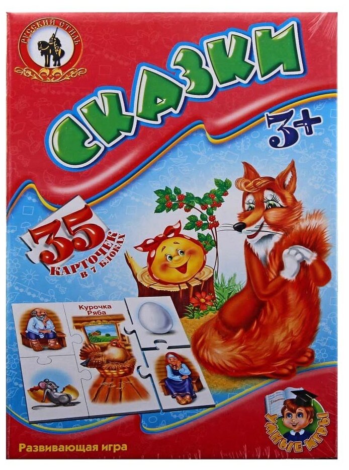Развивающая игра Сказки из серии Умные игры от компании Русский стиль - это развлечение, предназначенное для детей в возрасте от 3 лет. Игра состоит из 35 карточек в 7 блоках, которые ребенку нужно будет собрать как пазл. На карточках имеются различные изображения предметов и героев знаменитых сказок. Справляясь с такой задачей, ребенок научится анализировать, сопоставлять и находить связи между предметами и явлениями, что в свою очередь будет влиять на развитие его логического мышления.